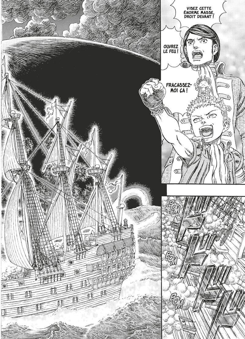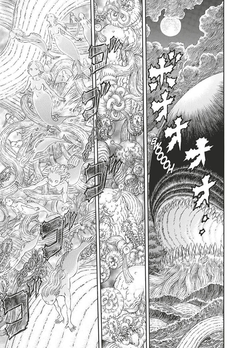 Accompagnée de Schierke qui a pris son corps de lumière, Berserk a plongé dans les entrailles du dieu des mers qui apparaît tout en faisant s’écrouler l’île isolée ! Mais une fois à l’intérieur, ils sont attaqués par des bancs de poissons monstrueux et le battement du coeur géant du dieu, qui rend fou ceux qui l’écoutent. Pendant ce temps, les sirènes amies d’Isma se sont regroupées autour de la créature. Le temps est venu pour le long combat entre ces deux adversaires de prendre fin. Que va-t-il advenir de Guts et de Schierke, qui sont sur le fil du rasoir