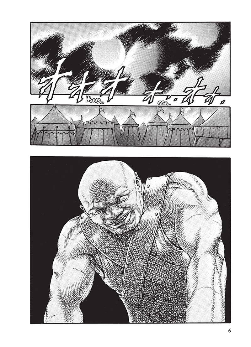 Ayant poussé son premier cri sous la dépouille de sa mère, Guts est recueilli et élevé à la dure par Gambino, le chef d’une troupe de mercenaires. Par delà la souffrance quotidienne, il devient le guerrier que l’on connaît. Pour défier la méchanceté de Gambino, Guts développe sa technique de l’épée et participe bellement à son premier siège en tant que mercenaire. Mais Gambino continue de le traiter durement. Dans la nuit, Donovan, un compagnon d’arme de Gambino, attaque Guts !