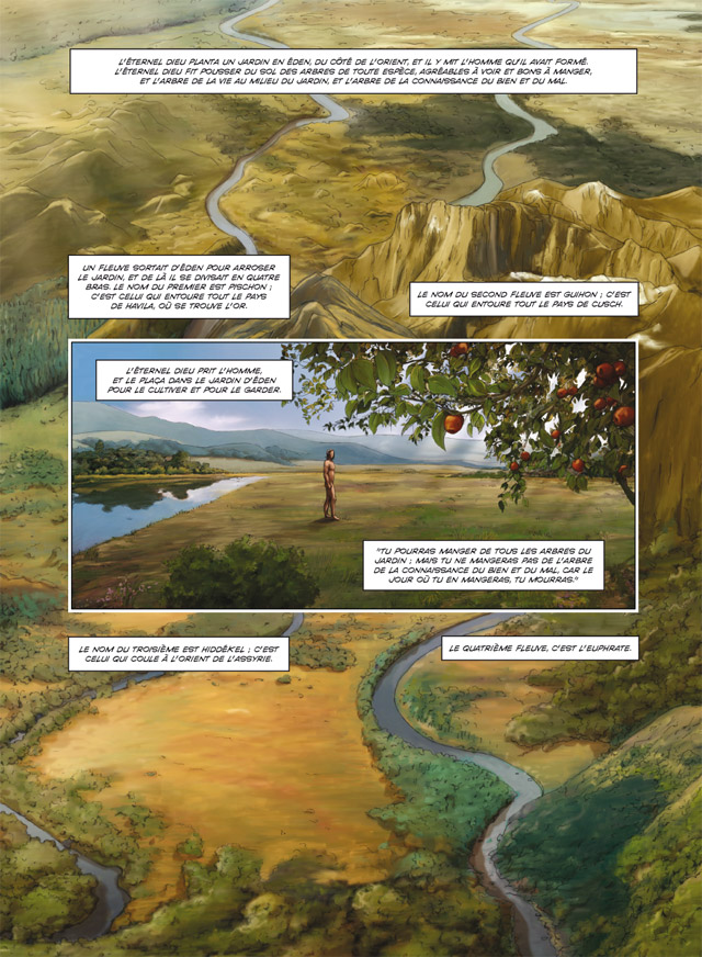 "Au commencement, Dieu créa les cieux et la terre." Par cette phrase s’ouvre l’un des textes fondateurs les plus importants de notre culture judéo-chrétienne. Cette adaptation fidèle - et oecuménique - des 31 premiers chapitres de La Genèse retranscrit successivement : la création du monde, Adam et Eve, Abel et Caïn, le déluge (Noé), la tour de Babel, la destruction de Sodome, le sacrifice d’Abraham et le rêve [l’échelle] de Jacob.