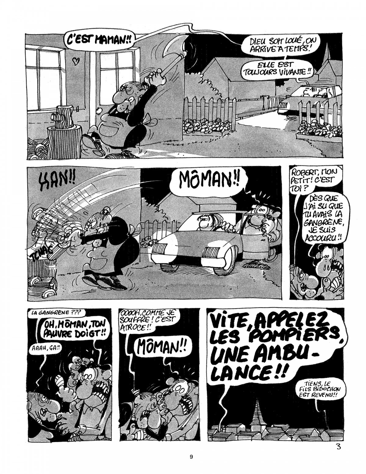 À peine apprend-il la mauvaise santé de sa "môman" que Robert accourt déjà à la rescousse. A la vue de son garçon chéri, la mère Bidochon reprend du poil de la bête et retrouve ses vieilles habitudes. Celles du temps où Robert était un enfant gâté qui adorait se déguiser en Zorro... Pendant ce temps, Raymonde subit les commentaires de sa belle-mère qui tombent comme autant de guillotines.