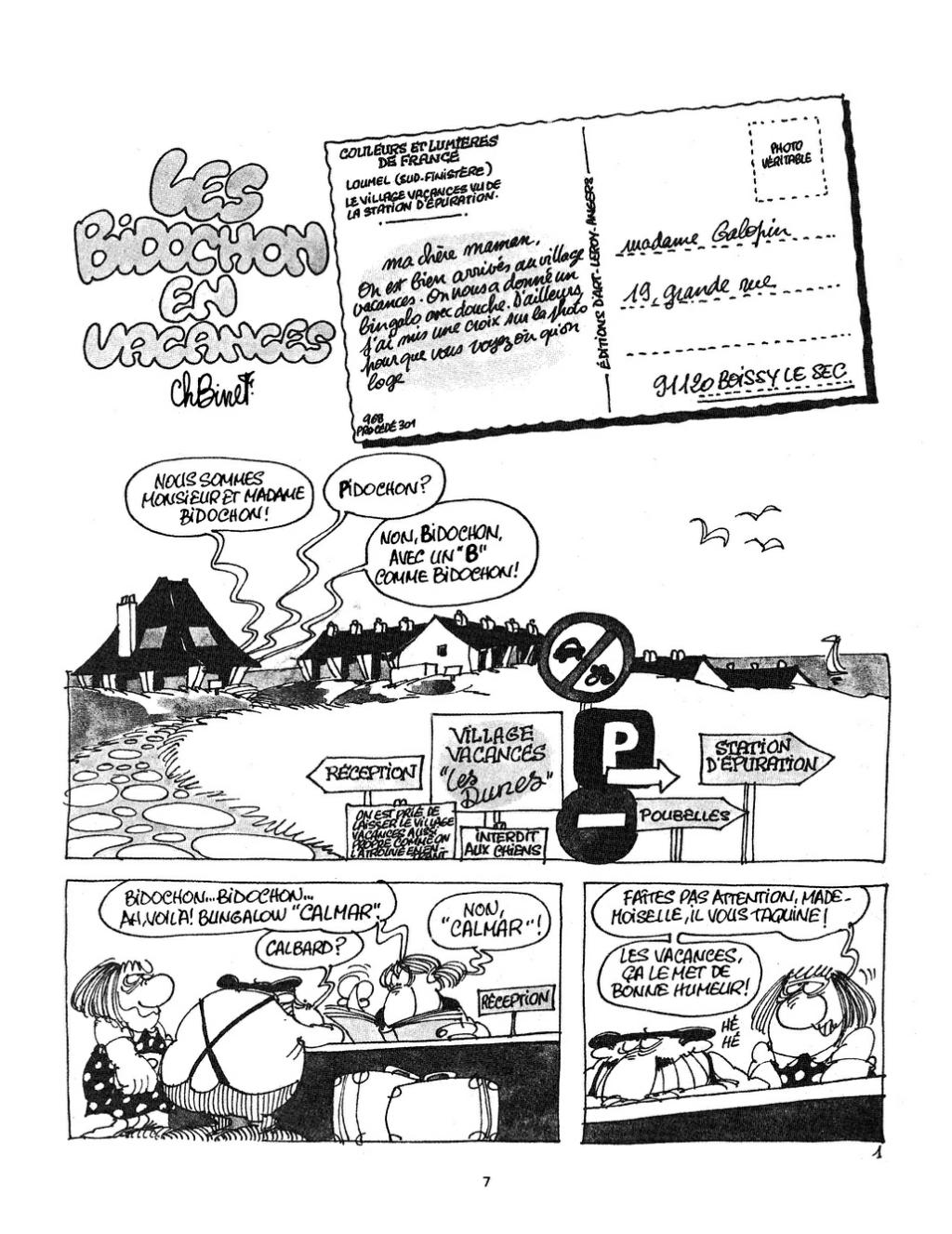 Les vacances des Bidochon sont, à l’image de ce couple, stupides à vomir. Elles ont pour cadre un village-vacances où BINET rassemble toute l’horrible médiocrité de notre belle société de loisirs organisés. De l’animateur des soirées "culturelles" à l’excursion "gastronomique", en passant par l’artisanat local et le musée des lacets, le bistouri de BINET pratique une vivisection à vous dégoûter à jamais de partir en vacances. Un document sociologique de valeur croqué par un très grand humoriste.