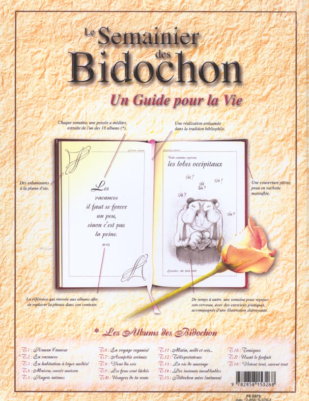 Honni soit qui mal y pense, il arrive aux Bidochon de penser plus qu’à leur tour. Ils pensent bien, ils pensent souvent et, dans leur infinie sagesse et incommensurable générosité, ils ont décidé de vous livrer leurs dites pensées. Ce sont de vrais morceaux de philosophie de la vie selon Bidochon, la vraie vérité de la France d’en bas qui vous sont enfin délivrés à travers quarante-six bidochiennes citations (extraites de 18 volumes de la série) et six binetiennes illustrations originales et bichonnées. Le tout dans un emballage digne d’un livre sacré, avec le signet en tissu qui fait bien chic. Un livre de chevet pour méditer sereinement et briller en société. Le bon sens chez vous, sur votre table de nuit.