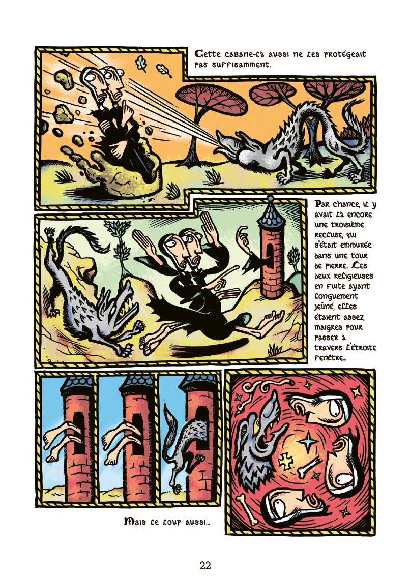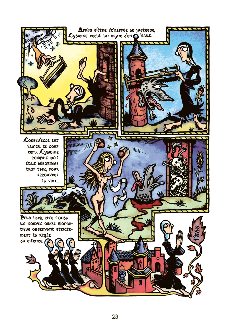 En fin connaisseur de la période médiévale et de sa représentation du monde, Marcel Ruijters redonne vie dans Les Bienheureuses à une petite quinzaine de figures féminines ayant acquis de haute lutte leur place au Paradis : la piété de Sainte Solange change le coeur des serpents qui rodent autour de son corps démembré, ceux-ci se fondront en elle pour lui fournir des prothèses bien pratiques dès lors qu’il s’agit de chasser les taupes du couvent ; Sainte Lydwine est poursuivie par le loup, et si la cabane qu’elle a construite de ses propres os ne suffit pas, peut-être que celle de sa consoeur, faite de bouse uniquement, saura éloigner la bête ? Marcel Ruijters nous livre, après Inferno, un recueil tendre et cruel de voies décidément impénétrables vers la sainteté. Un véritable livre d’heurts ! Avec son papier intérieur à fort grammage et enchassé dans sa couverture percée en ogive et marquée en dorure à chaud sur papier de création, Les Bienheureuses offre un confort de lecture qui ferait oublier le plus rude des prie-dieu. Mais surtout, Les Bienheureuses est dans la droite ligne de notre catalogue : auteur de tempérament, fabrication originale et raffinée, ainsi qu’un contenu qui, nous l’espérons, ne manquera pas de participer à l’édification de votre âme.