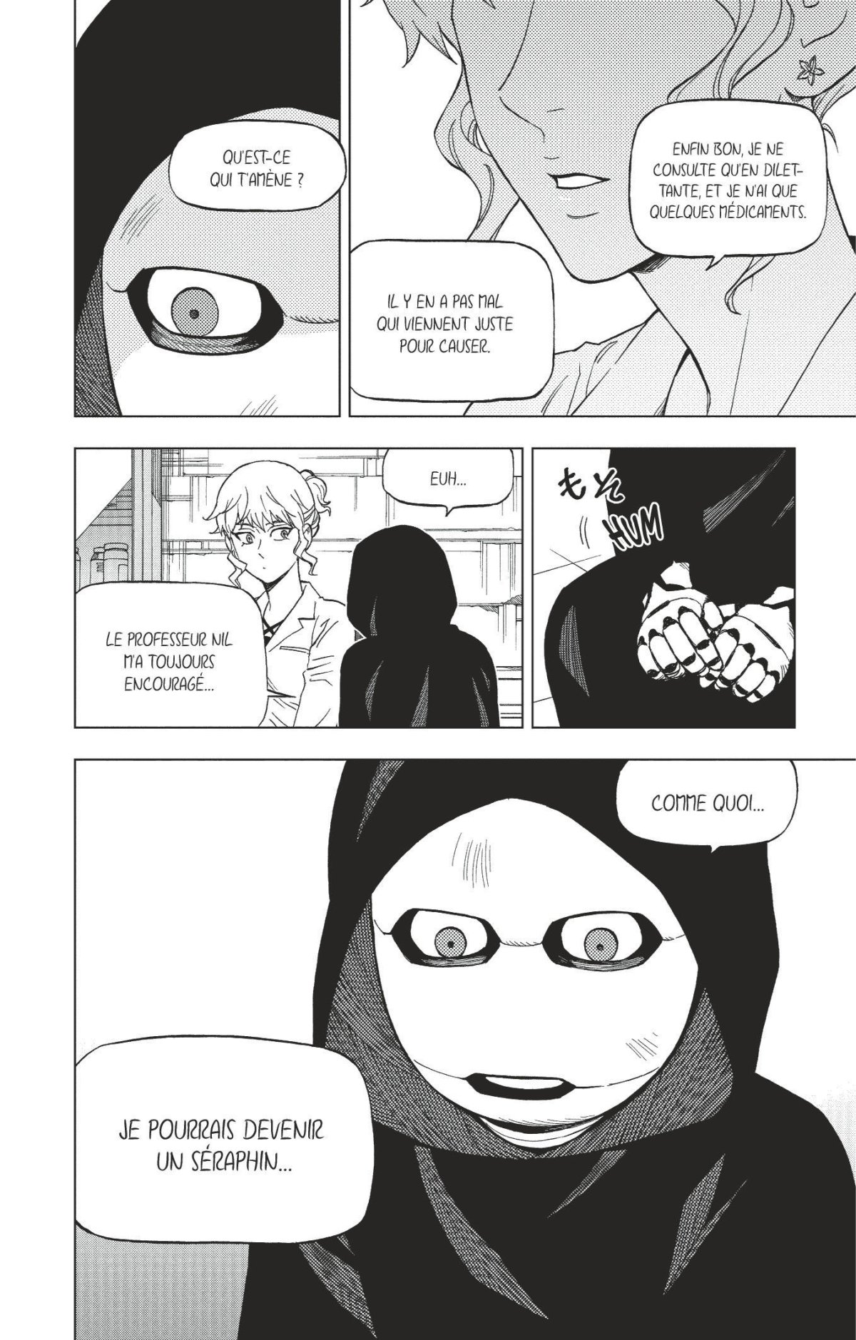 Dans ce volume, c’est vers l’Amérique du Sud que se dirigent nos héros dans le but de trouver le cinquième Birdmen originel. Cette fois, Takayama semble moins sûr de lui et les pistes sur l’identité du séraphin recherché sont plus vagues. Du côté des États-Unis, les Birdmen se rassemblent et passent à l’action, sous les ordres de leur reine, Robin. Mais quel est leur objectif ? Tout s’accélère tandis que les manigances du groupe Exodus et des Eve sont sur le point d’être révélées... L’autrice accélère le rythme de l’histoire tandis que plusieurs groupes de personnages passent à l’action, et que des révélations sont sur le point de voir le jour...