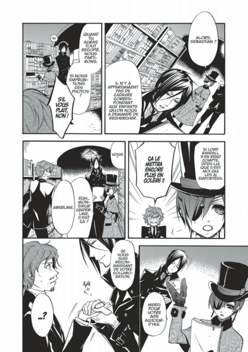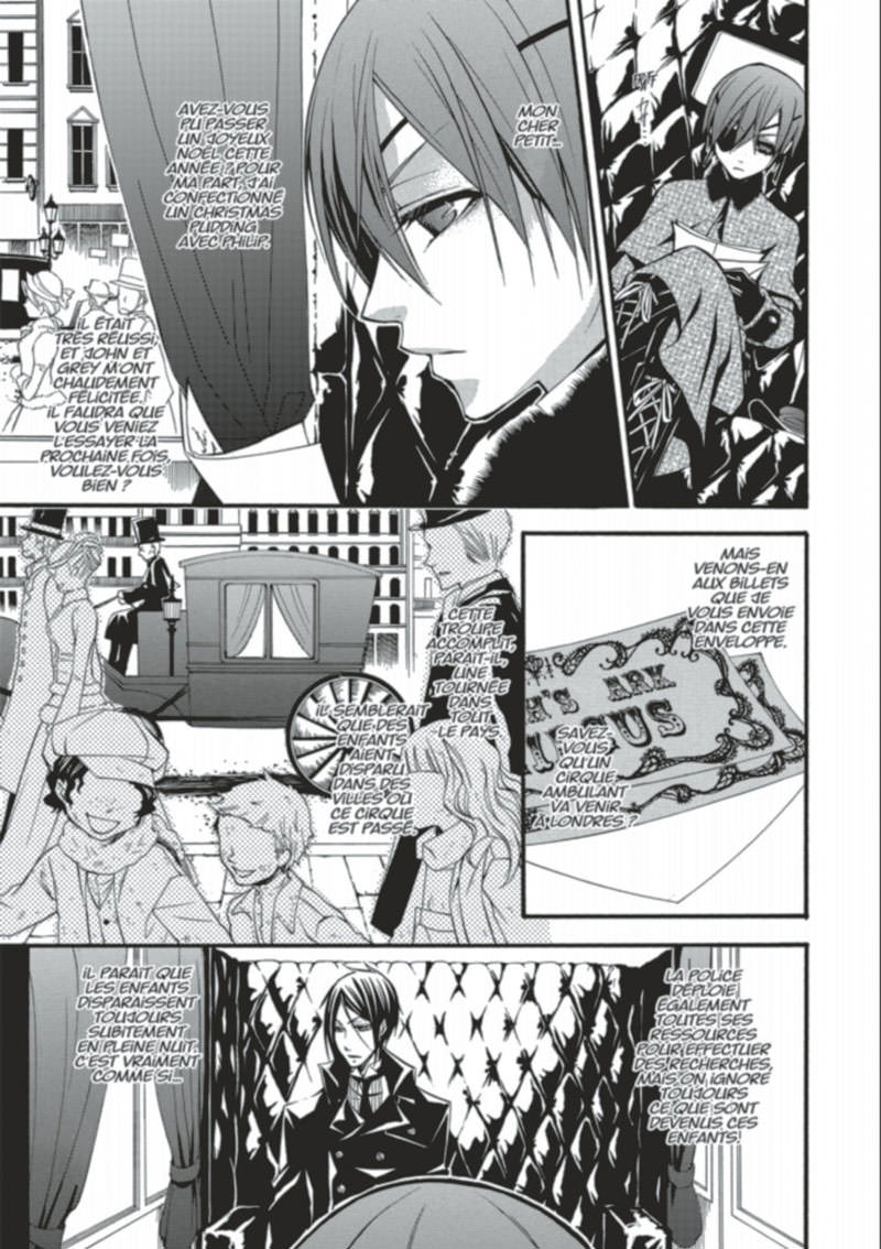 Un peu partout en Angleterre, des enfants ont disparu ! Sebastian et Ciel, qui a reçu l’ordre de résoudre l’affaire, pensent trouver la clé du mystère au sein d’un énigmatique cirque ambulant... Un clown pour le moins étrange, les balles du jongleur qui virevoltent... Si tel est le désir de mon maître, je l’accompagnerai jusqu’où il lui plaira.