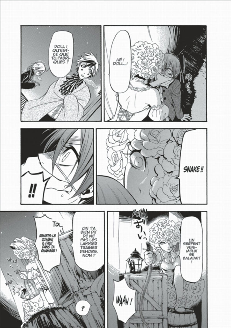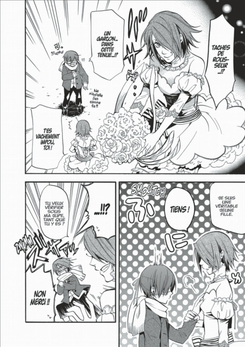 Ciel et son majordome sont entrés dans la troupe du cirque Noah’s Ark en dissimulant leur identité. Afin d’en apprendre plus sur leur bienfaiteur qui reste dans l’ombre, Sebastian s’approche furtivement d’une jeune femme de la troupe afin de la séduire... Les extrémités de ses doigts, pareilles à des plumes noires, dansent sur la peau de la dompteuse de fauve désarmée. Exécuter loyalement les ordres de son maître uniquement.