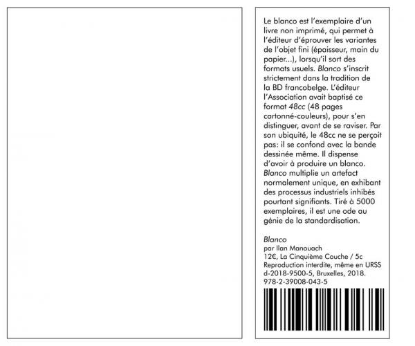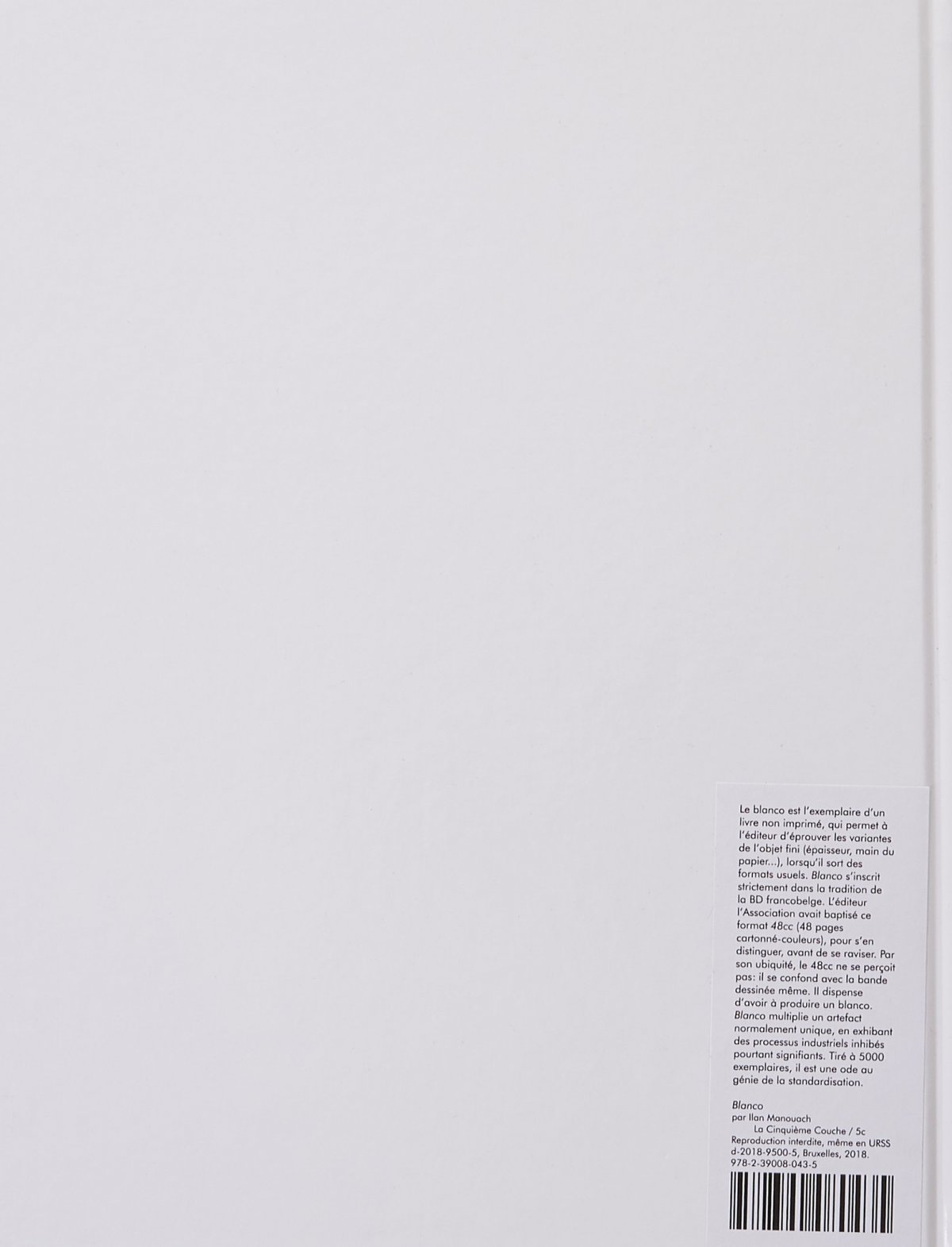 Dans le jargon de l’imprimerie, le blanco est un exemplaire d’un livre relié mais non imprimé qui permet à l’éditeur de se faire une idée précise de l’objet fini et d’en éprouver des variantes (apparence, poids, épaisseur, grammage et main du papier, etc.) lorsqu’il sort des formats usuels. Blanco s’inscrit strictement dans la tradition de la bande dessinée franco-belge telle qu’elle a été décriée naguère par Jean-Christophe Menu lorsqu’il fustigea la standardisation des formats, donc des contenus, dans les pamphlets d’Éprouvettes, en forgeant l’expression qui fit flores « 48cc » (abréviation de « 48 pages cartonné-couleurs », le standard industriel auquel ne dérogeaient pas encore les éditeurs mainstream)