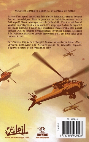 La vie d’un agent secret est loin d’être évidente, surtout lorsque l’on est amnésique. Alors le jour où un imbécile pervers qui se fait appelé Blank débarque dans le lycée d’Aki Clark en déclarant vouloir la protéger, il y a de quoi être sceptique ! Mais la capacité du jeune homme à créer des situations invraisemblables paraît séduire Aki et lorsque l’organisation terroriste Raizen s’attaque à la lycéenne, Blank va devoir démontrer qu’il est bien celui qu’il prétend être ! Par l’auteur Pop Mhan (Batgirl, Marvel Adventures Spider-Man, SpyBoy), découvrez une histoire pleine de satellites espions, d’agents secrets et de lycéennes sexy !