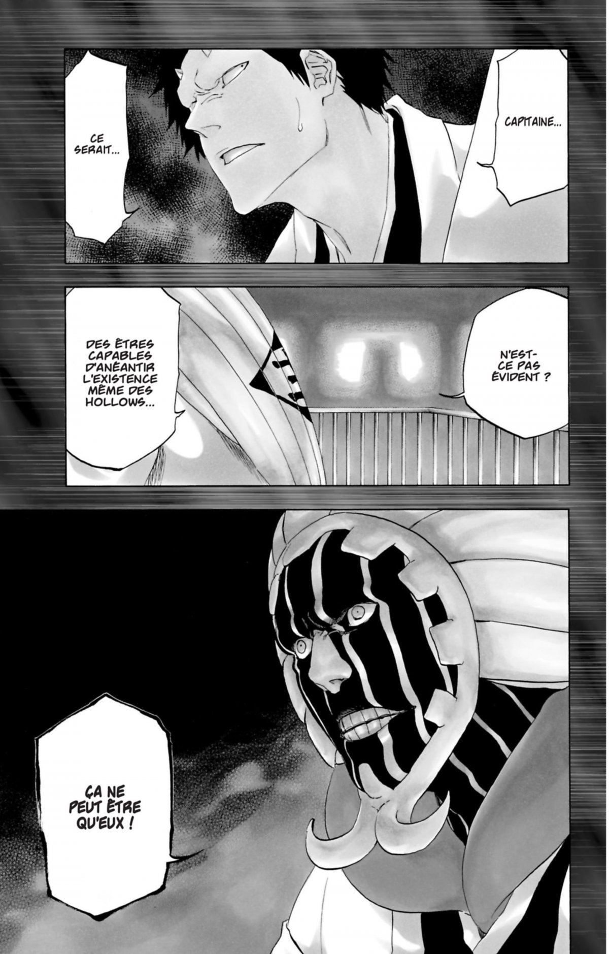 Une sonnerie d’alarme retentit à Soul Society, comme pour annoncer quelque chose. Des habitants de Rukongai ont soudain disparu. Pendant ce temps, à Karakura où se trouvent Ichigo et les autres, une ombre suspecte s’est approchée sans bruit...L’histoire est entrée dans son dernier chapitre. Le rideau se lève sur l’arc de la sanglante guerre de mille ans !