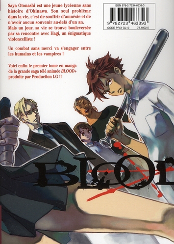 Blood, the last vampireest avant tout une série de romans signés Mamoru Oshii, par ailleurs réalisateur de longs métrages animés à succès tels Jin Roh, Patlabor, Ghost in the shell, Avalon. De ces romans fut tiré un film long métrage, paru en France chez Manga vidéo et en manga chez Panini France. Le succès du titre étant avéré, une série de dessins animés fut produite en 2005 sous le titre Blood +et, en 2006, Bill Kong ( Tigre et Dragon) a annoncé la mise en chantier d’un film Live. Des jeux vidéo Blood, sur PSP et PS2, ont paru à la suite du succès de la licence. Entre-temps, une série de manga a été créée, en trois parties fonctionnant en cross over : Blood + / Blood + A / Blood + Yakikoushi. C’est cette série de manga qui vous est présentée par Glénat en 2008. Chaque partie est dessinée par un auteur différent et reconnu, et forme un tout cohérent en dehors d’une connaissance a priori des animés.Saya semble une lycéenne vivant une vie normale sur l’île japonaise d’Okinawa. Elle a été adoptée et n’a aucun souvenir datant de plus d’un an. Cependant, elle souffre de réminiscences troublantes. Il lui revient ainsi des souvenirs datant de son combat contre des démons pendant la seconde Guerre Mondiale mais aussi dans la Russie du début du XXe siècle. La plus oppressante de ses réminiscences conce rne un manoir français du XIXe siècle qui révèle en fait le milieu où elle a été élevée. Saya est #néée# en 1833 dans un cocon provenant d’une momie de chiroptère aux côtés de sa soeur Diva. Saya et Diva sont en fait les derniers vampires connus, nés en ce monde pour abattre tous les démons.