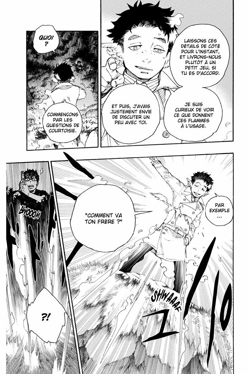 Le Fujô-ô s’est finalement réveillé, et sur le Mont Kongô, la bataille fait rage entre le colossal démon et les membres de la secte Myôda. Non content d’avoir libéré le monstre et dompté le flamboyant Garuda, le professeur Tôdô cherche à présent à briser Yukio en faisant remonter à la surface ses peurs enfouies. Loin de se douter de l’épreuve que son frère est en train de traverser, Rin arrive en vue de l’abomination, qui continue de s’étendre et mute progressivement en une gigantesque forteresse organique : le Château du Roi Immonde. Pour le vaincre, Rin n’aura d’autre choix que de maîtriser enfin ses flammes démoniaques.