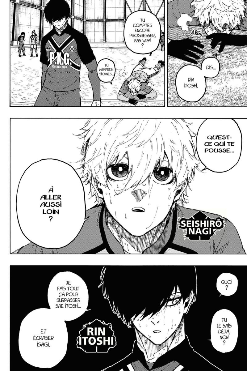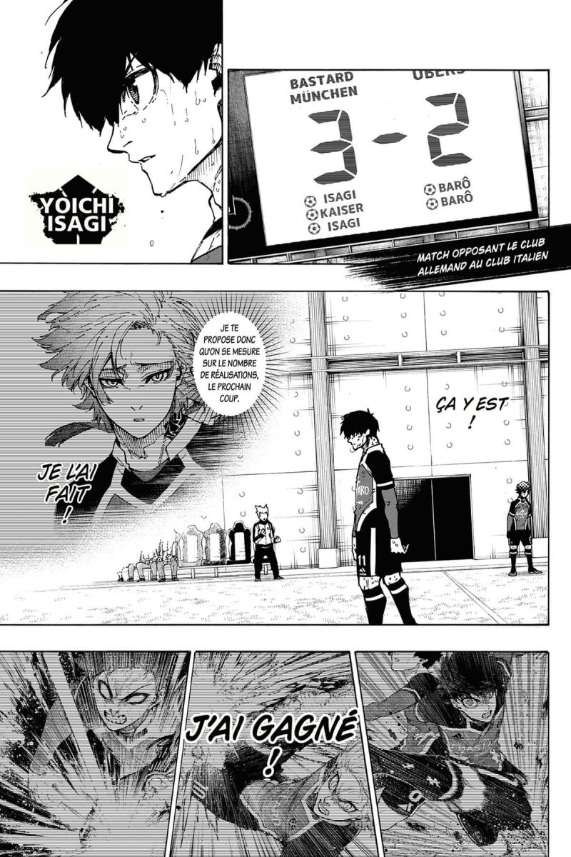 Le but décisif d′Isagi et Hiori permet au club allemand de l′emporter sur son rival italien. Isagi, exalté par la victoire et boosté par sa nouvelle offre, devient plus que jamais la cible directe de Kaiser, enflammé par son désir de revanche et hanté par un passé mystérieux. De son côté, le club français prépare son affrontement final contre l′équipe allemande, fort d′un style de jeu inédit porté par les deux individualistes aux tempéraments opposés : Rin et Shidô. L′ultime acte de la Ligue des néo-individualistes, qui tient le monde entier en haleine, est sur le point de commencer. Ce dernier match, totalement imprévisible, pourrait bien redéfinir à jamais l′histoire du football !