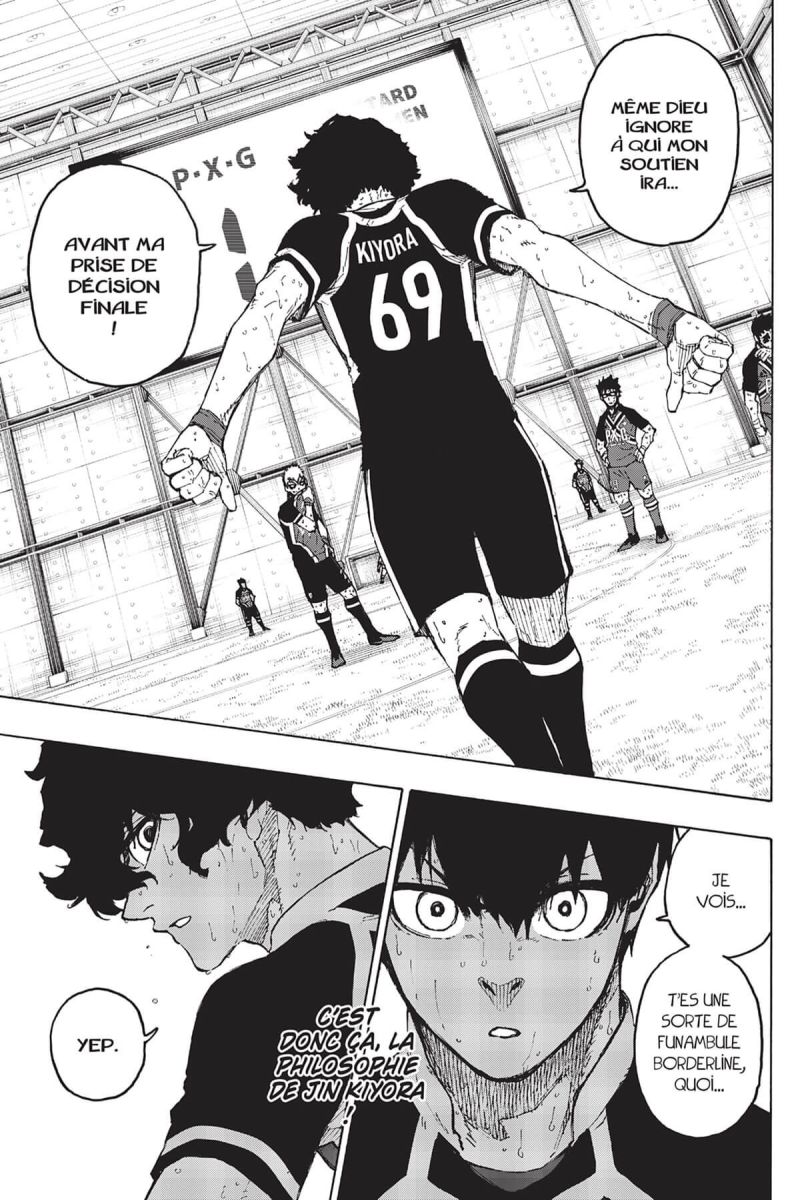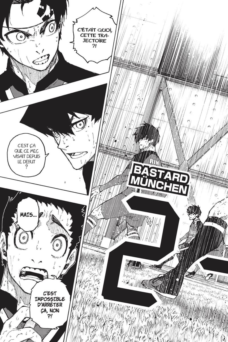 Le nouveau tir de Kaiser a fait mouche, donnant l’avantage au club allemand sur son adversaire français dans cette finale de la Ligue des néo-individualistes ! Afin de vaincre "l’empereur", désormais éveillé à un nouveau stade, Isagi analyse tous les individualistes sur le terrain en cherchant une faille à exploiter !De son côté, Rin, coincé et incapable de trouver la moindre ouverture, replonge dans ses souvenirs dans le but de déchiffrer ses propres pulsions... La lutte pour le titre de numéro un enflamme le terrain comme jamais ! Pour réussir à graver sa légende dans le monde entier, il faudra défier son rival au péril de sa vie !