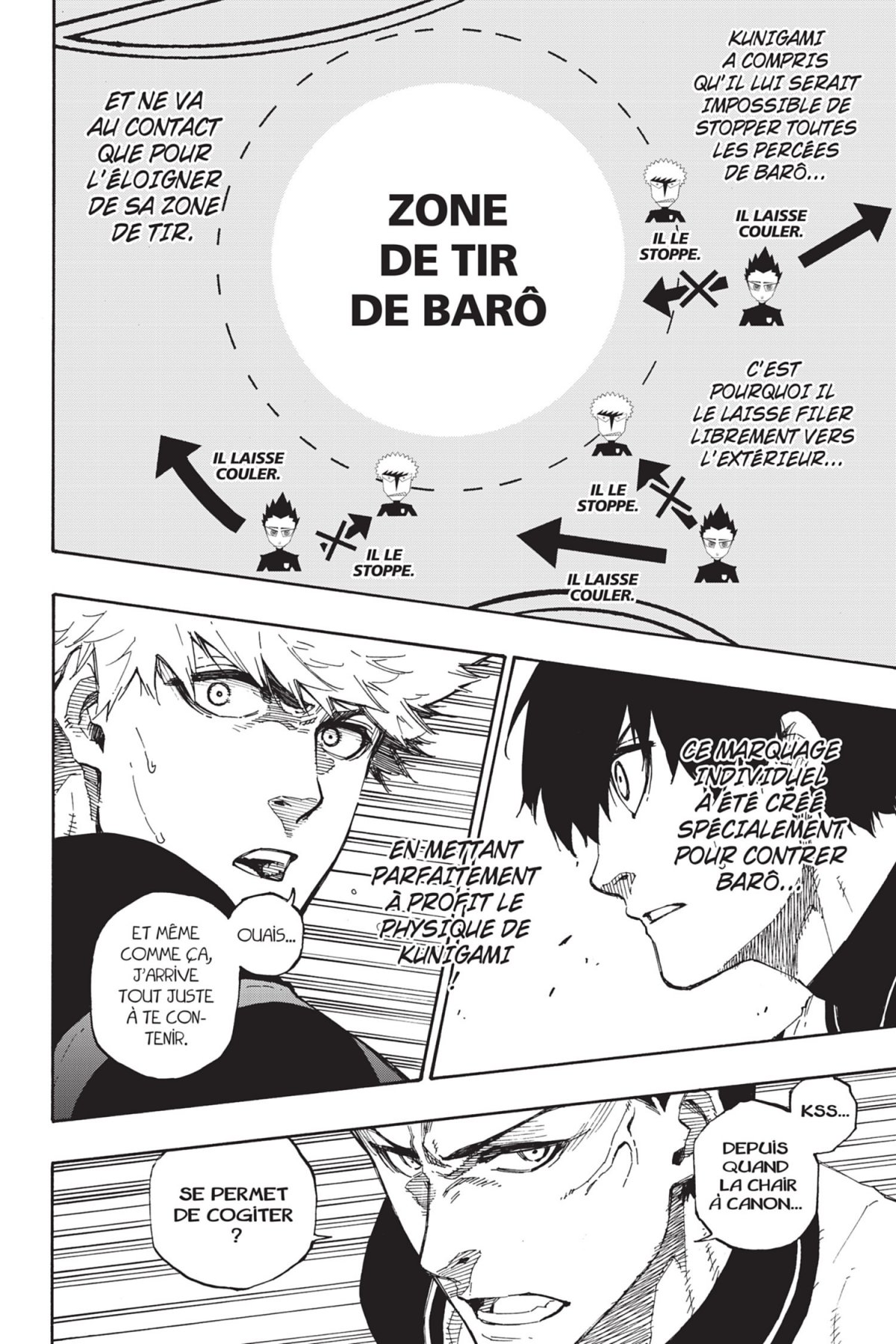 La bataille des rivaux se poursuit. Après avoir récupéré Barô dans leur équipe, c’est à Kunigami, Chigiri et Reo qu’Isagi et Nagi vont devoir faire face. Les deux équipes étant de force égale, Isagi devra nécessairement créer l’alchimie avec ses coéquipiers et évoluer en coursde match. L’effet conjugé des égos d’Isagi et Nagi portera-t-il un coup fatal à l’individualisme de Barô ? L’issue du match s’avère des plus incertaines...