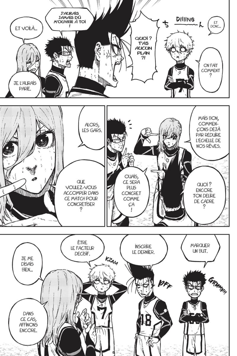 L’ultime affrontement du tournoi des rivaux atteint son paroxysme : tout se jouera sur le dernier but ! Face au football réaliste et analytique de Karasu, Nagi et son équipe décident de tout miser sur une stratégie basée sur leurs rêves ! Les nouvelles émotions découvertes par Nagi en plein coeur de l’affrontement influenceront-elles son destin ? Et qui décochera la frappe décisive ?!