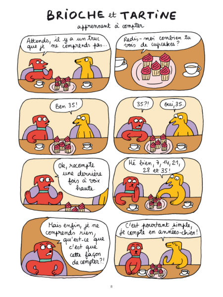 Qui se ressemble s’assemble, ce ne sont pas Brioche et Tartine qui diront le contraire. Cet irrésistible duo partage un goût prononcé pour le ridicule et un sens inné de la bêtise. Pour notre plus grand plaisir, les deux chiens se chamaillent sur la moindre broutille du quotidien. Leurs débats (entre autres pour savoir si les chèvres ont bien des dents !) tournent vite à un étalage de mauvaise foi et mettent la logique à rude épreuve. Tartine semble toutefois avoir un brin plus de jugeote que Brioche. Il n’a pas son pareil pour jouer des tours à son ami. Mais lors d’une descente en luge, les compères finissent tous deux, le museau dans la neige