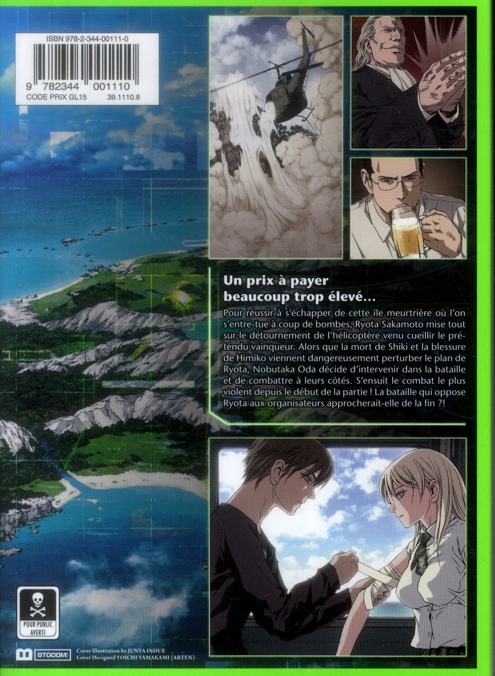 Pour réussir à s’échapper de cette île meurtrière où l’on s’entre-tue à coup de bombes, Ryota Sakamoto mise tout sur le détournement de l’hélicoptère venu cueillir le prétendu vainqueur. Alors que la mort de Shiki et la blessure de Himiko viennent dangereusement perturber le plan de Ryota, Nobutaka Oda décide d’intervenir dans la bataille et de combattre à leurs côtés. S’ensuit le combat le plus violent depuis le début de la partie ! La bataille qui oppose Ryota aux organisateurs approcherait-elle de la fin ?