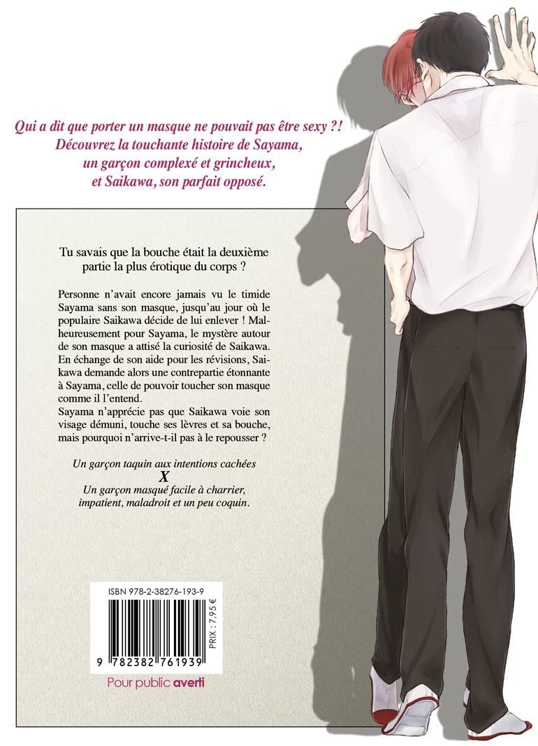 Personne n’avait encore jamais vu le timide Sayama sans son masque, jusqu’au jour où le populaire Saikawa décide de lui enlever ! Malheureusement pour Sayama, le mystère autour de son masque a attisé la curiosité de Saikawa. En échange de son aide pour les révisions, Saikawa demande alors une contrepartie étonnante à Sayama, celle de pouvoir toucher son masque comme il l’entend.Sayama n’apprécie pas que Saikawa voie son visage démuni, touche ses lèvres et sa bouche, mais pourquoi n’arrive-t-il pas à le repousser ? Qui a dit que porter un masque ne pouvait pas être sexy ?! Découvrez la touchante histoire de Sayama, un garçon complexé et grincheux, et Saikawa, son parfait opposé.