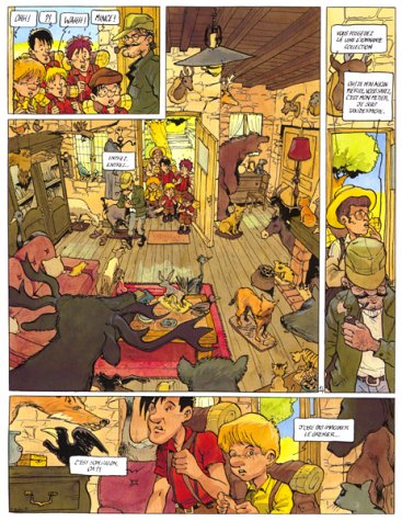 Pour finir les vacances en beauté, Soupetard part camper avec ses copains Grandgaillard, Millemouches, Mistouf et Chunelfivout. A eux cinq (plus le lapin Cerfeuil), ils forment la patrouille des Ecureuils, managée par Madame J’ordonne, une bonne femme assez reveche comme son nom l’indique. Pour commencer, il pleut des cordes et elle les envoie chasser le dahu comme l’exige la coutume. Le plus marrant, c’est que Chunelfivout rapporte un dahu ! Vu de plus pres, c’est en réalité un chat empaillé, raide comme la justice, avec un seul oeil (de vitre) - ce qui est au moins aussi étrange qu’un dahu... Madame J’ordonne exige qu’on rende la chose a son propriétaire, un certain Blandin qui exerce le métier de taxidermiste. Mais la, tout se complique : l’homme a tout du faux-jeton, des gitans rôdent dans le coin avec un toutou "féroce" baptisé Paillasson, et les bestioles empaillées - outre qu’elles plongent Soupetard dans des cauchemars terribles - sont apparemment utilisées pour un odieux trafic. L’adorable Soupetard et ses copains vous débrouillent toute cette embrouille mine de rien, a grand renfort de naiveté, d’humour, de grosses trouilles et de raisonnements farfelus. Et encore une fois, Corbeyran et Berlion restituent ce parfum d’enfance vraie, marrante et aventureuse, qui ne cesse de nous ravir.