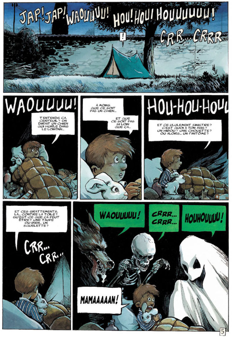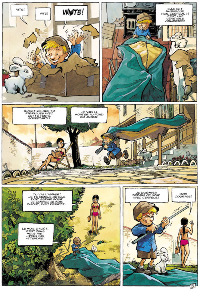 Sous le préau, la dernière cloche de l’année a sonné, énergiquement secouée par Monsieur Albert, et c’est la ruée vers les vacances. Au menu, les joies du camping dans le jardin (avec loups et fantômes), le Tour de France (trois heures d’attente pour voir passer à tout berzingue un embouteillage flou), la plage sous la flotte, la carte postale pour Elodie (un vrai boulot), les champignons (Soupetard refuse d’en manger et c’est une bonne idée), les photos loupées et la traditionnelle rédaction de rentrée : "Racontez vos vacances." Entre deux épopées, ça fait toujours plaisir de retrouver Soupetard en "p’tites histoires". Soupetard et ses projets, ses enthousiasmes, ses dégoûts - les coques, "ça se mange ou ça se collectionne seulement ?" -, ses déceptions de môme, ses trouilles et ses bonheurs. Sans oublier sa soeur à lunettes, son copain Millemouches (ce n’est pas une image, les mouches l’adorent) et le lapin Cerfeuil