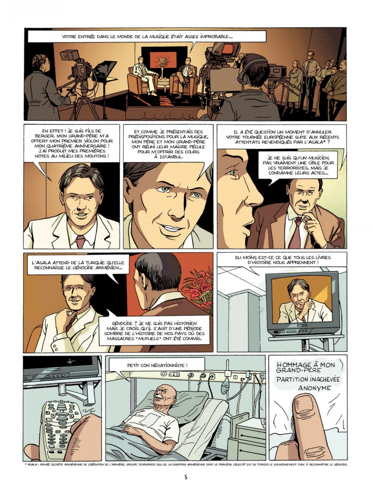 Il y a près de 100 ans, le génocide arménien... Paris, 1983. Le concert d’un jeune violoniste turc est interrompu par le malaise d’un spectateur. Alors que les secours sont attendus, le vieillard prononce quelques mots qui attirent vivement l’attention du musicien. Dès le lendemain, il se rend au chevet de Dikran Sarian, septuagénaire arménien. Le vieil homme se lance alors dans un long récit : celui du premier génocide du 20e siècle, le génocide arménien. Anatolie, 1915. Dikran a neuf ans. Sur ordre d’Istanbul, les Arméniens doivent être éradiqués. Partout, l’armée ottomane rassemble les hommes et les supprime sommairement. Femmes, vieillards et enfants sont évacués et contraints à une longue marche vers la mort. Le jeune musicien écoute avec intérêt le récit de Dikran. Et cette histoire va provoquer un véritable bouleversement dans ses croyances et ses convictions.