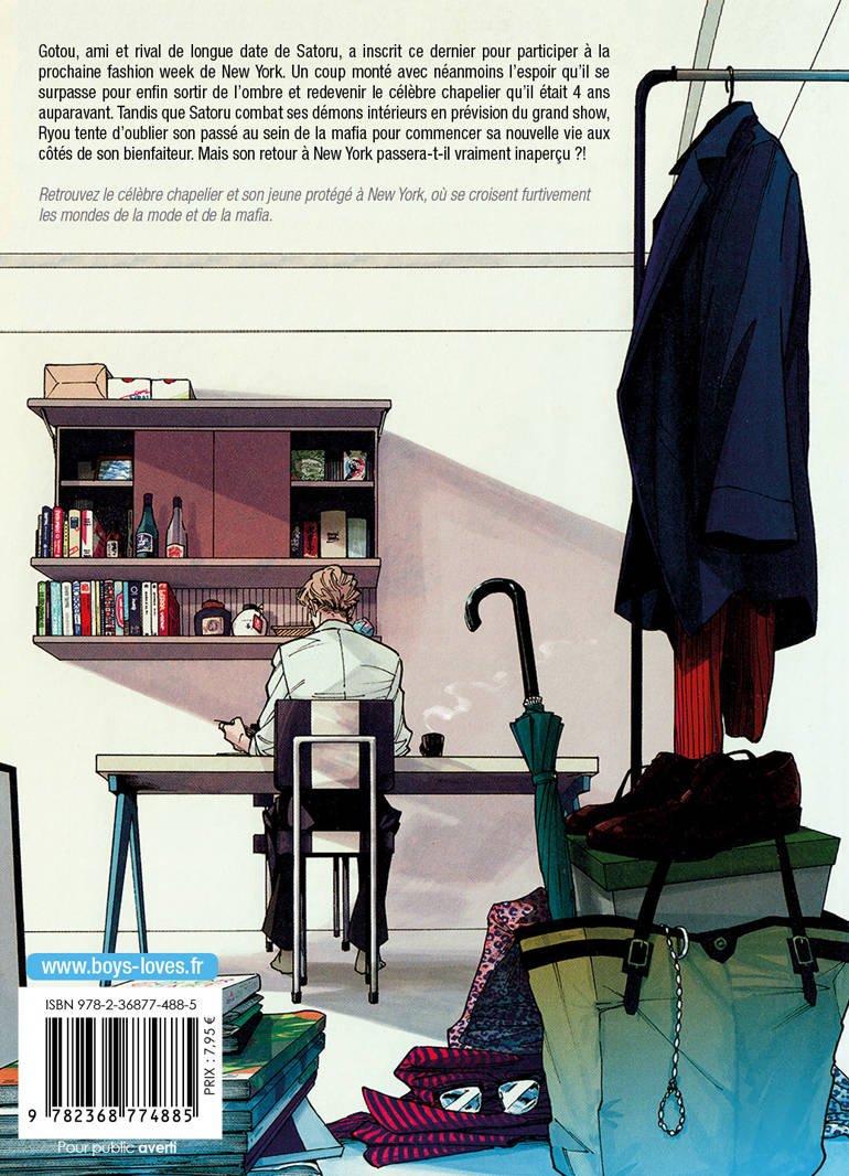 Gotou, ami et rival de longue date de Satoru, a inscrit ce dernier pour participer à la prochaine fashion week de New York. Un coup monté avec néanmoins l’espoir qu’il se surpasse pour enfin sortir de l’ombre et redevenir le célèbre chapelier qu’il était 4 ans auparavant.Tandis que Satoru combat ses démons intérieurs en prévision du grand show, Ryou tente d’oublier son passé au sein de la mafia pour commencer sa nouvelle vie aux côtés de son bienfaiteur. Mais son retour à New York passera-t-il vraiment inaperçu ?! Retrouvez le célèbre chapelier et son jeune protégé à New York, où se croisent furtivement les mondes de la mode et de la mafia.