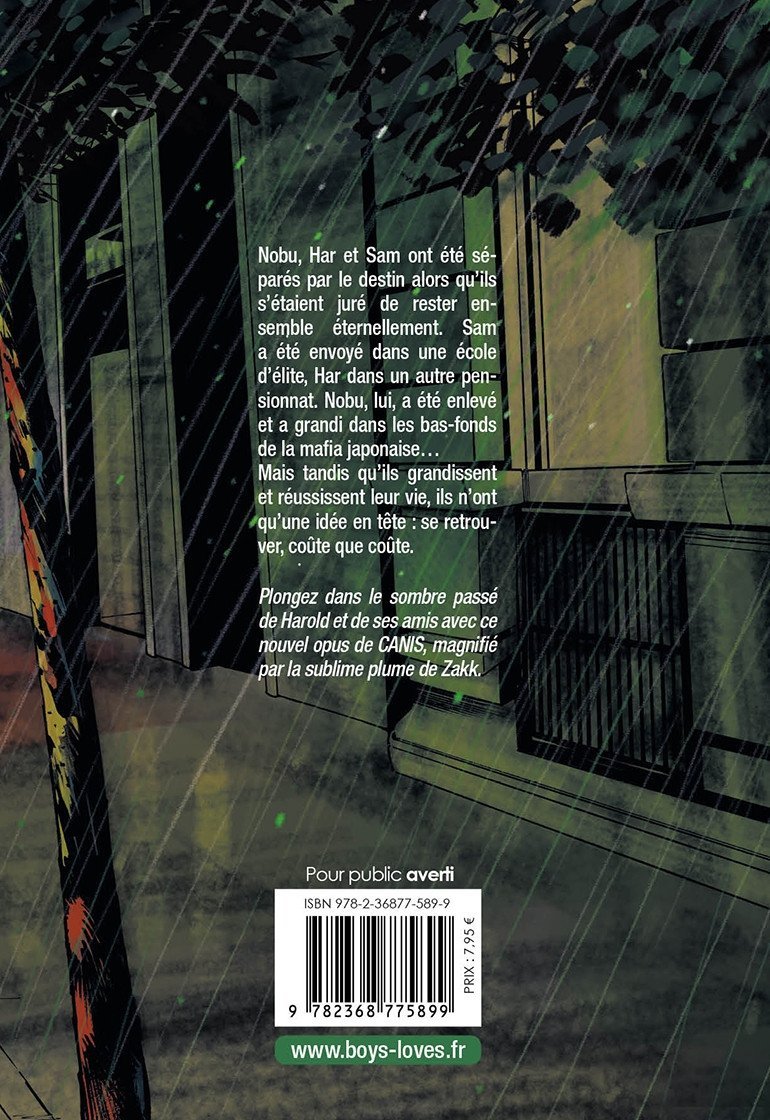 Nobu, Har et Sam ont été séparés par le destin alors qu’ils s’étaient juré de rester ensemble éternellement. Sam a été envoyé dans une école d’élite, Har dans un autre pensionnat. Nobu, lui, a été enlevé et a grandi dans les bas-fonds de la mafia japonaise...Mais tandis qu’ils grandissent et réussissent leur vie, ils n’ont qu’une idée en tête : se retrouver, coûte que coûte. Plongez dans le sombre passé de Harold et de ses amis avec ce nouvel opus de CANIS, magnifié par la sublime plume de Zakk.