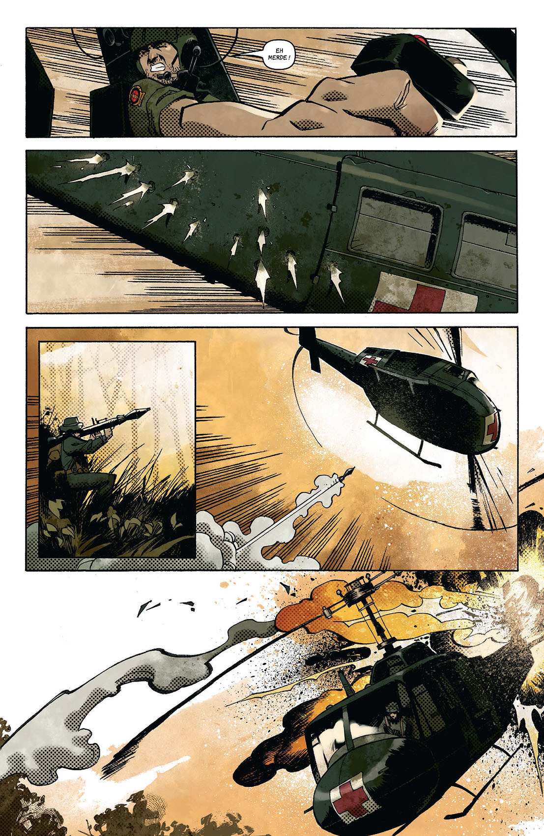 1969, guerre du Vietnam. Gordon Chase est pilote d’hélicoptère d’évacuation médicale, sous le feu ennemi. Quand son hélicoptère est abattu par les soldats vietcong, s’engage alors un jeu du chat et de la souris au coeur de la jungle et des rizières. Mais son équipe et lui vont bientôt découvrir qu’il y a plus encore que les horreurs de la guerre en territoire hostile.Un graphic novel viscéral, qui retrace le destin poignant et fantastique du père des enfants découverts dans The Cape.