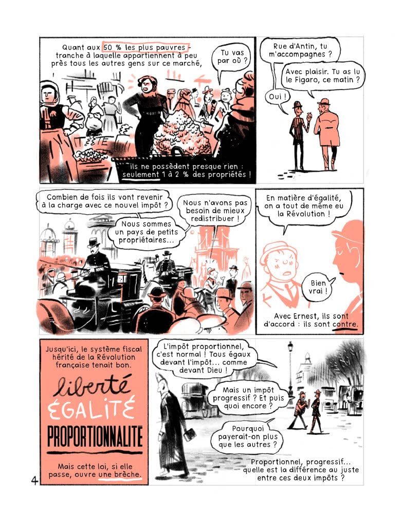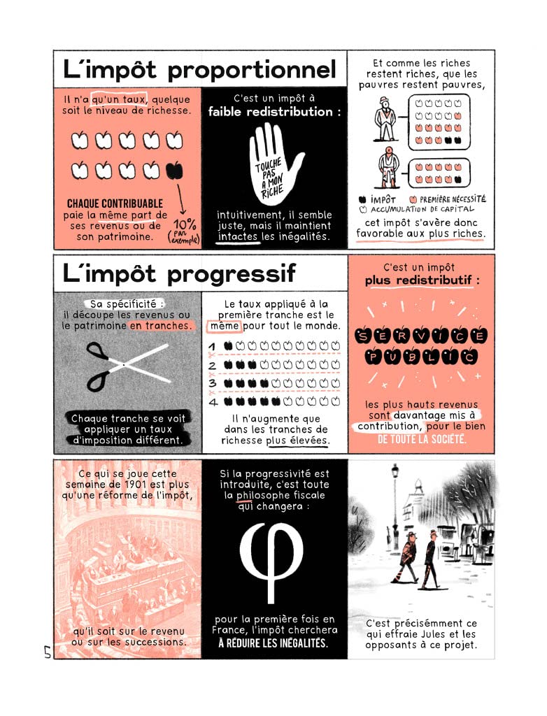 Dans une démarche didactique, parfois teintée d’humour, les auteurs ont eu recours à la fiction. Jules, le personnage principal, né à la fin du XIXe siècle, incarne le rentier, figure privilégiée d’une société hyper inégalitaire où la propriété est sacralisée. Lui, sa famille et son entourage vont vivre l’évolution des richesses et de la société