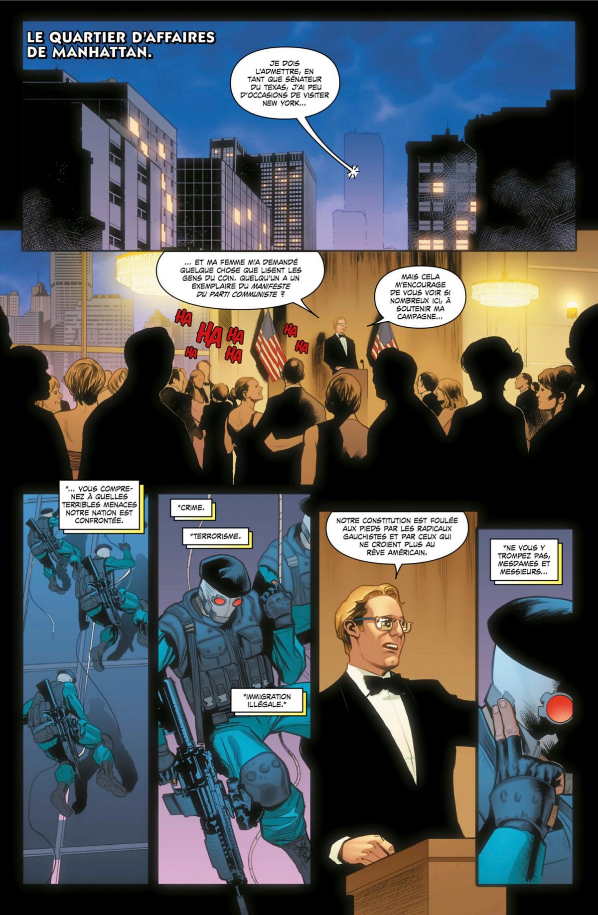 Sam Wilson observe les citoyens qui manifestent contre le super-héros. Néanmoins, face à une organisation terroriste, deux Captain America seront nécessaires ! Sam Wilson est dans une position des plus délicates, puisque de nombreux citoyens manifestent contre Captain America qu’ils considèrent illégitime. Pourtant, face à l’organisation terroriste Ultimatum, deux Captain America ne seront pas de trop