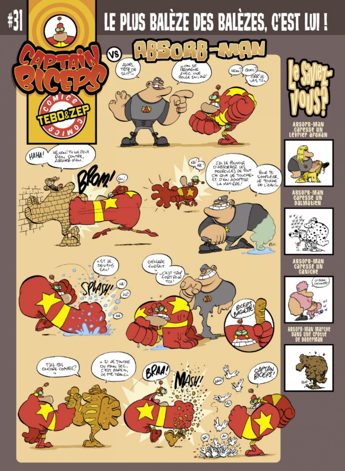 Vous pensiez avoir tout vu sur les super-héros. Vous pensiez, blasés, que plus aucun super-pouvoir ne pouvait vous épater. Vous vous disiez « Oula, les sup’héros, depuis Spider-man et Superman et Batman, on n’a rien fait de mieux ». Mais là fatale erreur vous étiez dans l’ignorance, car qui peut ramollir la Chose, épousseter l’Homme-Sable ou faire remonter le prince de la jungle dans son arbre ? Qui je vous le demande ? Mais évidemment, l’incomparable, l’inénarrable, l’indestructible ... Captain Biceps, le plus grand justicier de tous les temps !!! Redresseur de tort méconnu, il mérite à présent sa place dans le panthéon des vengeurs masqués. Retenez bien son nom, car il sillonnera l’horizon pour punir tous les malfrats : Captain Biceps !