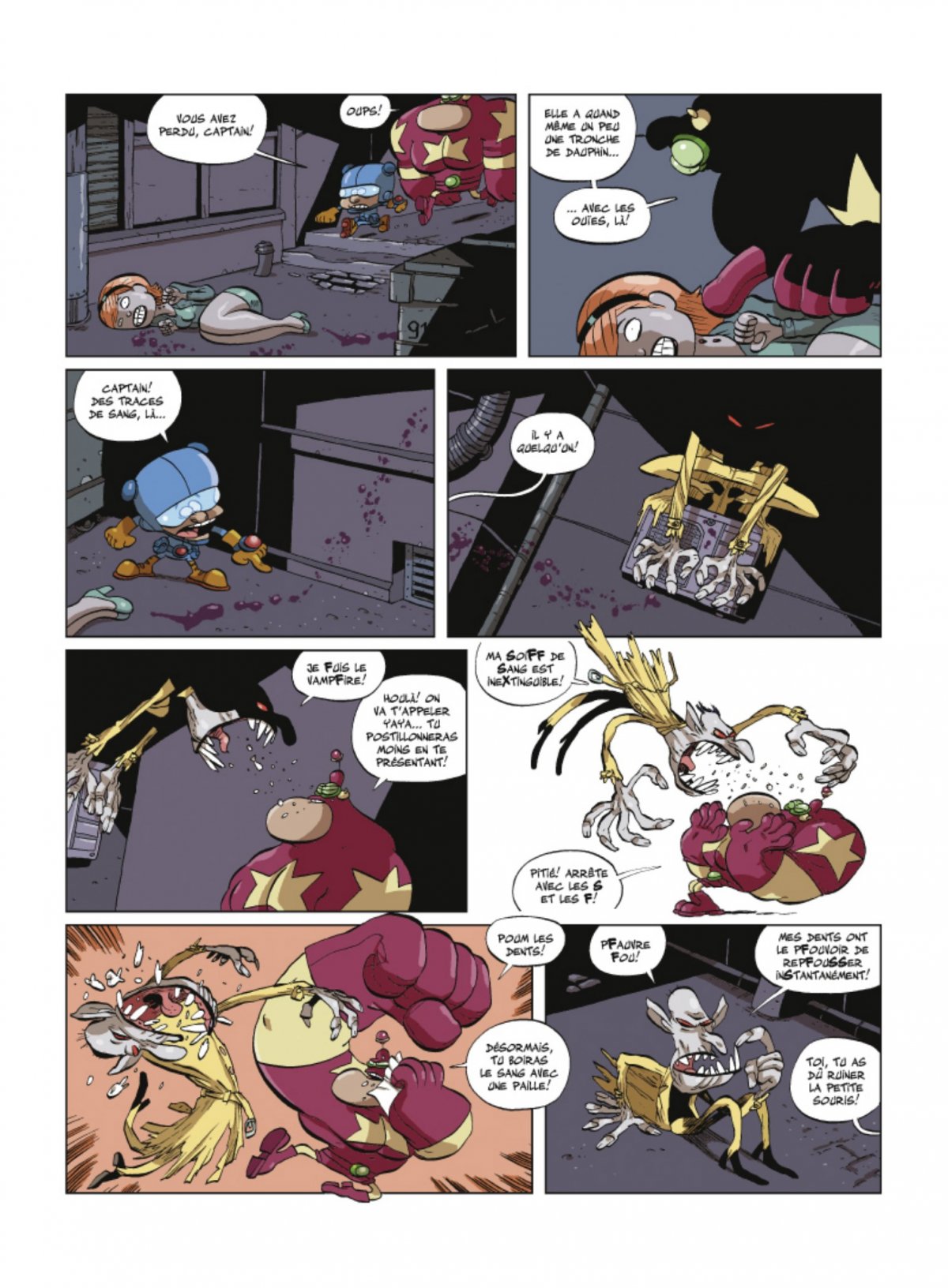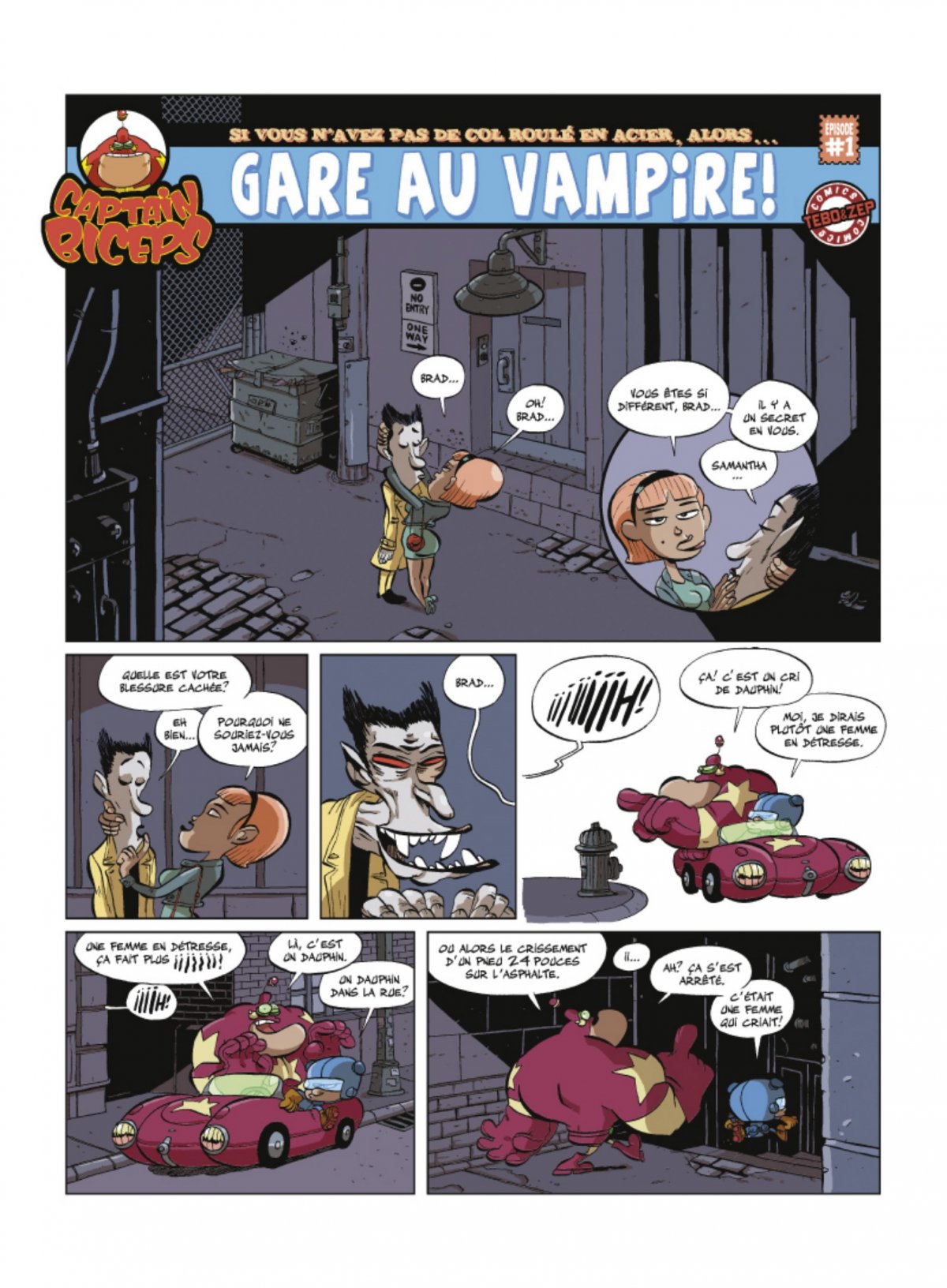 Faites gaffe aux baffes, Captain Biceps revient ! L’invincible, le redoutable, l’invulnérable, l’inoxydable, l’intrépide Captain Biceps est de retour ! Eh oui, les super-vilains n’ont pas fini de semer la pagaille et notre justicier en collants rouge va avoir fort à faire... Imaginez un peu : une armée de vampires postillonneurs, un Croco mutant et un Renifleur fou, quand ce n’est pas Squale-Man qui vient carrément gâcher les vacances de Biceps à la plage ! Et ce n’est pas tout : l’infâme docteur Nuisible, qui décidément porte toujours aussi bien son nom, échafaude un plan machiavélique pour s’échapper de prison, afin de rendre la monnaie de sa pièce au plus balèze des super-héros... Prends garde, Captain Biceps !Voici venir enfin le nouvel opus des aventures de Captain Biceps et de son acolyte Genius, dans lequel ils reviennent jouer des biscotos à travers plusieurs histoires courtes face à des adversaires tous plus déjantés les uns que les autres !