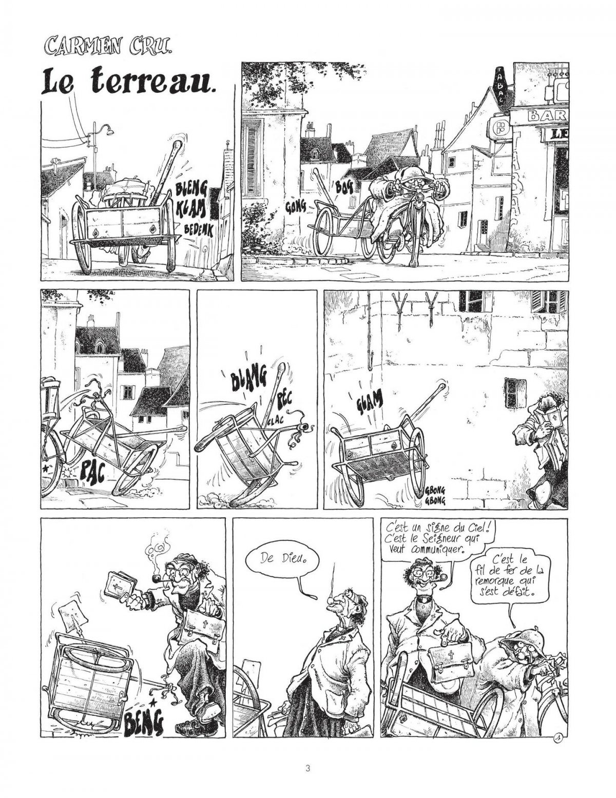 Carmen Cru, en 9 récits complets, règle maintenant ses comptes avec le curé de choc, le médecin, ses cousins, les éboueurs, etc... LELONG nous fait pénétrer de plus en plus loin dans cet univers très inhabituel en BD, qu’il a créé autour de sa vieille héroïne, univers de vieux, de petites gens, de paysans rapaces, univers de hargne et aussi de solitude. Mais grâce au talent et à l’humour de LELONG, c’est avec beaucoup de tendresse que nous est contée cette chronique. A déguster avec délicatesse.