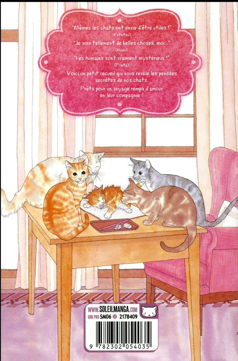 Ce manga est un véritable journal intime félin ! Alors venez vite découvrir la vie des chats vue par les chats. Chaque chat a son but dans la vie, ou sa passion. Nous autres pauvres humains sommes bien ignorants de tout ce qui peut se passer dans leur petite tête ! On se surprend à les envier, parfois les plaindre, être attendris, mais en tout cas, après cette lecture, vous réfléchirez à deux fois avant de prendre un matou pour une vulgaire boule de poils. À travers chaque chat-pitre, c’est une nouvelle page du journal intime d’un chat que vous découvrirez !