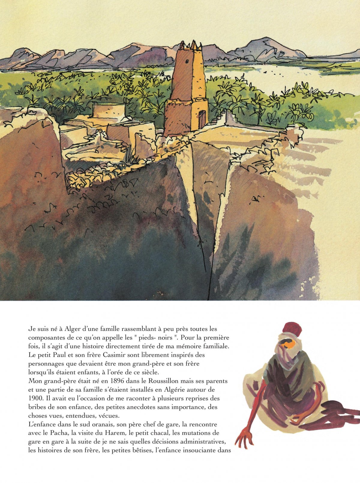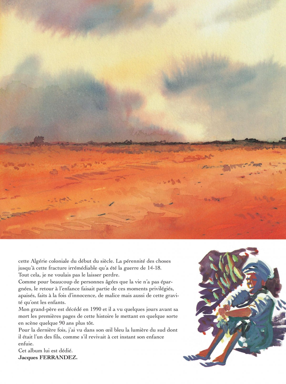 Troisième volet de la chronique algérienne de Ferrandez, ce récit retrace, à travers le regard d’un enfant, les premières années du siècle dans le Sud algérien. Sur cette terre écrasée de chaleur cohabitent, bon an mal an, des communautés venues de tous les rivages de la Méditerranée. Fragile puzzle humain, toujours au bord de l’éclatement, tant "là-bas", le racisme est ordinaire et la haine banalisée. Comme le dit le petit Paul : "Ici, le Français il se croit plus fort que l’Espagnol. L’Espagnol il crache sur l’Italien, l’Italien il dit que le Maltais c’est un chien. Le Maltais il traite l’Arabe de fainéant, et l’Arabe il méprise le Juif. Et encore, des fois, c’est l’inverse.
