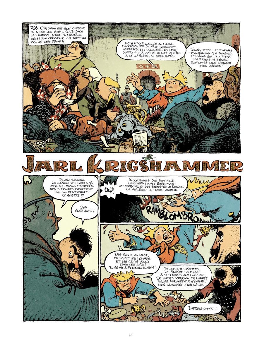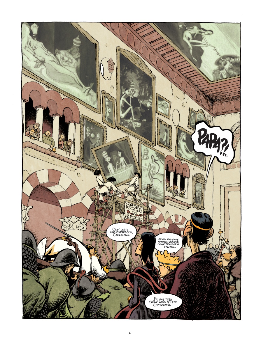 Entre guerroiements, négociations et complotations, le quotidien de Charlemagne, balloté par ses amours à haute altitude avec Himiltrude qui lui mène la vie rude, prend bien souvent le pas sur ses devoirs régaliens ! Pierre Place, de sa plume virtuose et de son dessin grandiose, nous livre ici une chronique rigoureusement presque historique de cette dynastie carolingienne, si chère aux coeurs de nos instituteurs, et nous dévoile les dessous, légèrement au fond, à gauche, de la grande Histoire de France, de sa splendeur et de ses vices, poil à l’institutrice.