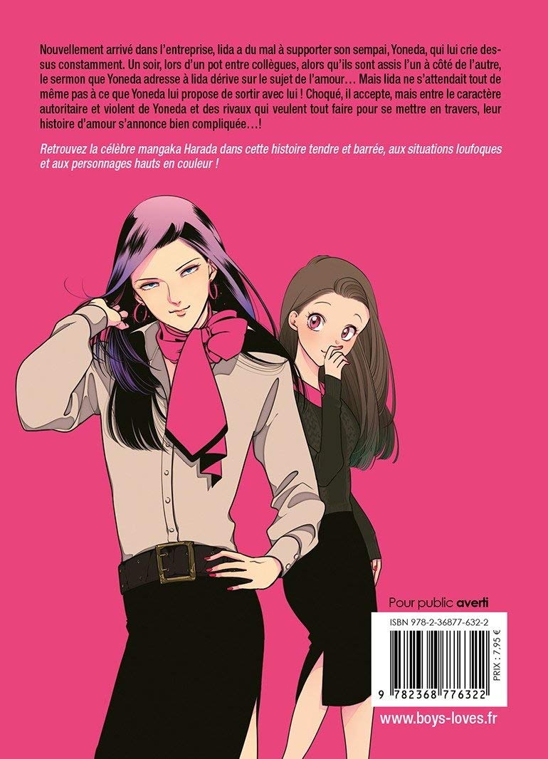 Nouvellement arrivé dans l’entreprise, Iida a du mal à supporter son sempai, Yoneda, qui lui crie dessus constamment. Un soir, lors d’un pot entre collègues, alors qu’ils sont assis l’un à côté de l’autre, le sermon que Yoneda adresse à Iida dérive sur le sujet de l’amour... Mais Iida ne s’attendait tout de même pas à ce que Yoneda lui propose de sortir avec lui ! Choqué, il accepte, mais entre le caractère autoritaire et violent de Yoneda et des rivaux qui veulent tout faire pour se mettre en travers, leur histoire d’amour s’annonce bien compliquée...!Découvrez Harada dans cette histoire tendre et barrée, aux situations loufoques et aux personnages hauts en couleur !