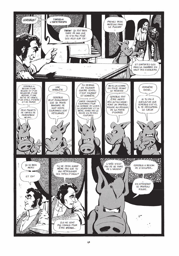 Débuté en 1977, Cerebus est une saga culte qui se termine en 2004, soit un graphic novel de quelques 6000 pages. Pendant toutes ses années, Dave Sim nous fait partager la vie de Cerebus, un oryctérope à la moralité trouble, parfois sympathique, parfois impitoyable, souvent grossier, alcoolique, misanthrope