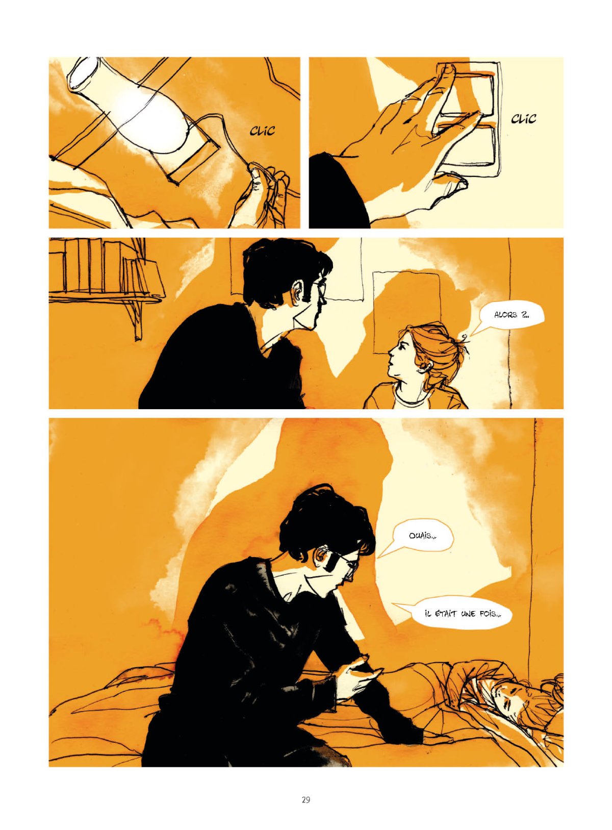 Elisa a bouleversé la vie de Fabien et Aude. Leur relation a été élimée par la réalité. L’hôpital public pour elle, l’abattoir pour lui. Un soir où Fabien couche sa fille, il commence à inventer, avec elle, une histoire pour l’endormir. Quelques jours après, il découvre un cochon tatoué qui lui intime un rapprochement entre sa vie et ses rêveries. Bien que conscient que ce n’est qu’une coïncidence, Fabien y puise la force de changer sa trajectoire. Il quitte l’abattoir en volant le cochon. Il découvre alors l’autrice des arabesques et décide de lui offrir la possibilité de finir son oeuvre
