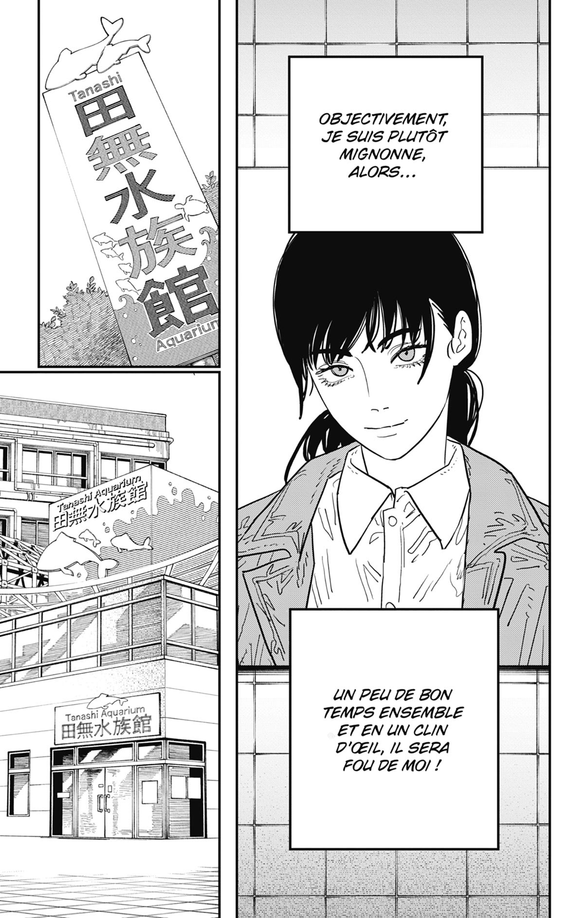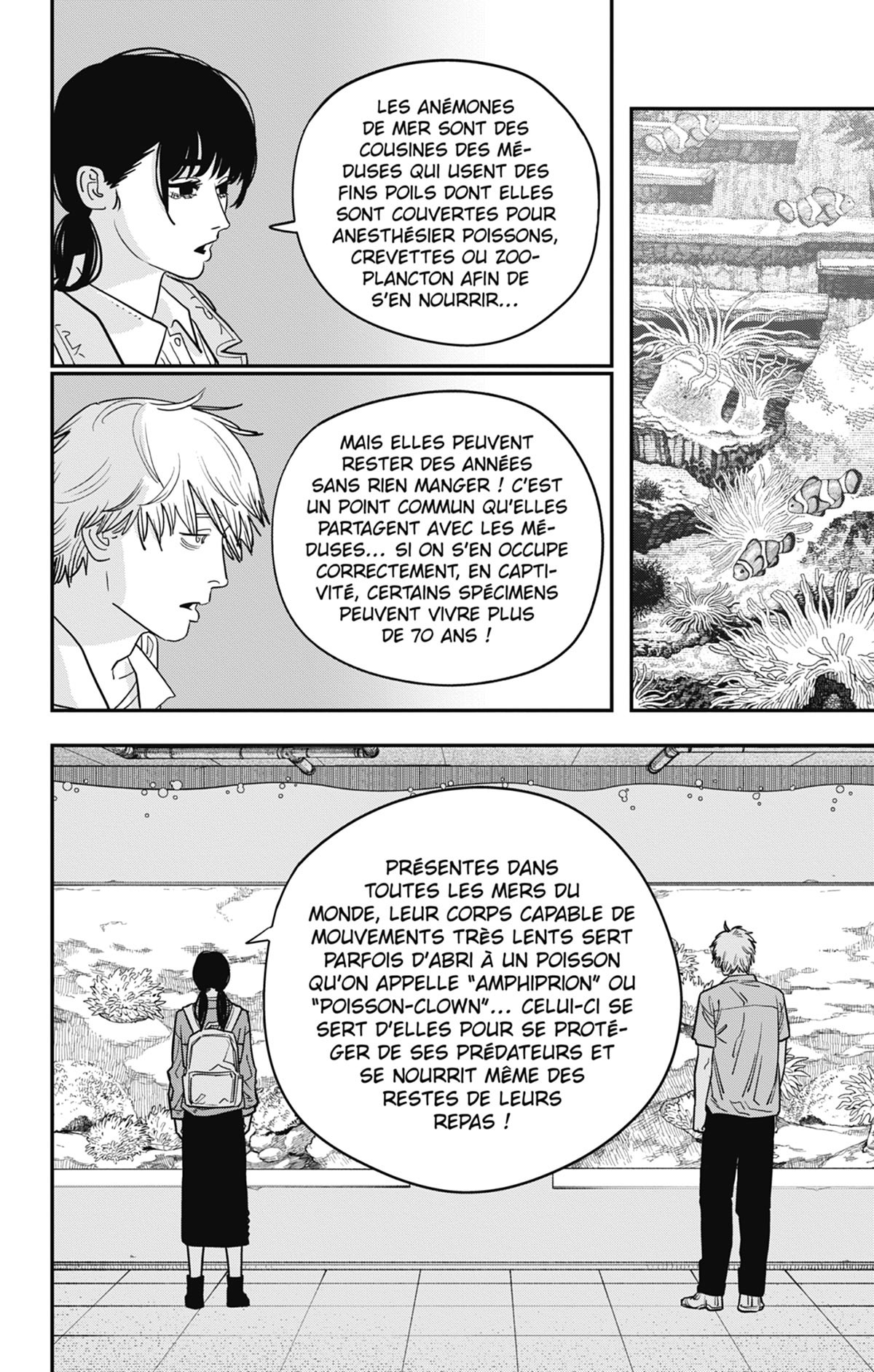 Pour son rendez-vous avec Denji, Asa a choisi... l’aquarium ! Afin de le transformer en arme, elle tente maladroitement de le séduire. Mais il n’a qu’une idée en tête : voir des pingouins ! Et tandis que l’alchimie peine à prendre entre eux deux, un nouveau démon entre en scène et le rencard vire au cauchemar...