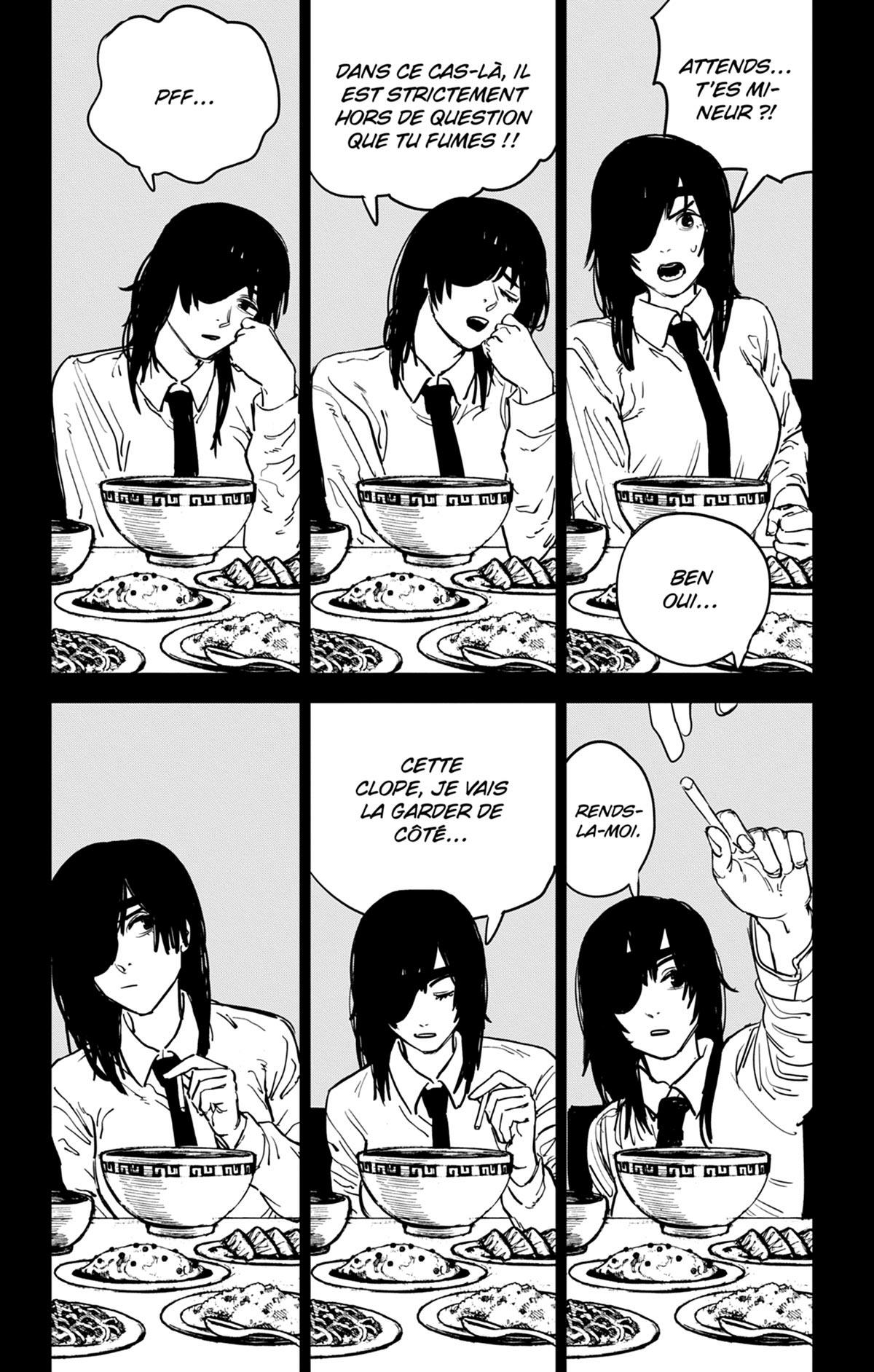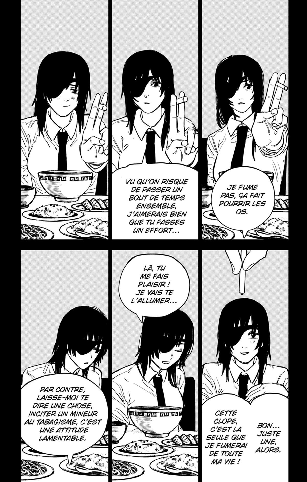 Suite aux attaques dont ses agents ont été les cibles, la Sécurité Publique a décidé de contre-attaquer en engageant toutes ses forces dans la bataille ! Dévoré par les flammes de la vengeance, Aki se retrouve confronté à Ghost, le puissant démon qu’employait autrefois l’agent Himeno... De son côté, Denji affronte une nouvelle fois Samouraï Sword ! Tronçonneuse contre katana... quelle lame aura le dessus ? !