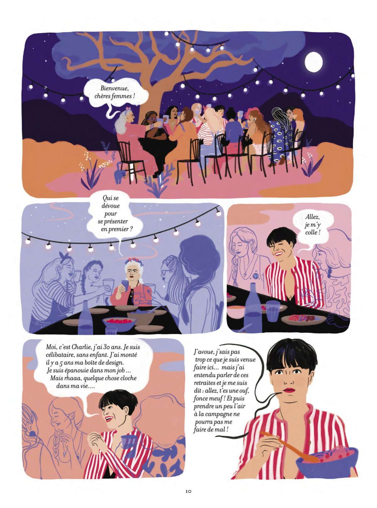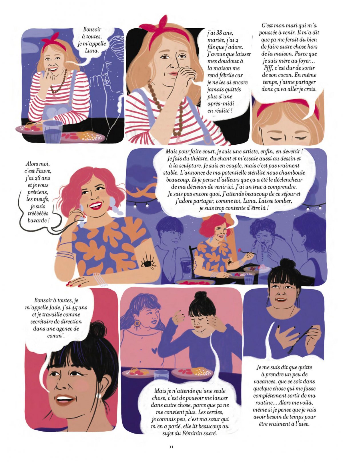 Une retraite « Tente Rouge » en forêt avec un groupe de 13 femmes qui symbolisent les 13 chemins de vie existants selon l’enseignement de Jamie Sams. 13 mères de clan, chacune associée à un cycle lunaire. 13 femmes s’interrogent et échangent. Lors de ce cercle, elles pratiquent des rituels, mantras et chants, autour de leur quête de reconnaissance, de leur mission de vie, de reconnexion à leur espace sacré de femme. Elles débutent ce cercle de femmes, fébriles et fragiles, pour le terminer, 13 jours plus tard, éclairées, fortes, ancrées, libres, rayonnantes et ensemble, fortifiées par cette sororité puissance et bienveillante. Cet album est conçu comme un guide initiatique, un recueil d’expériences inspirées de la réalité.