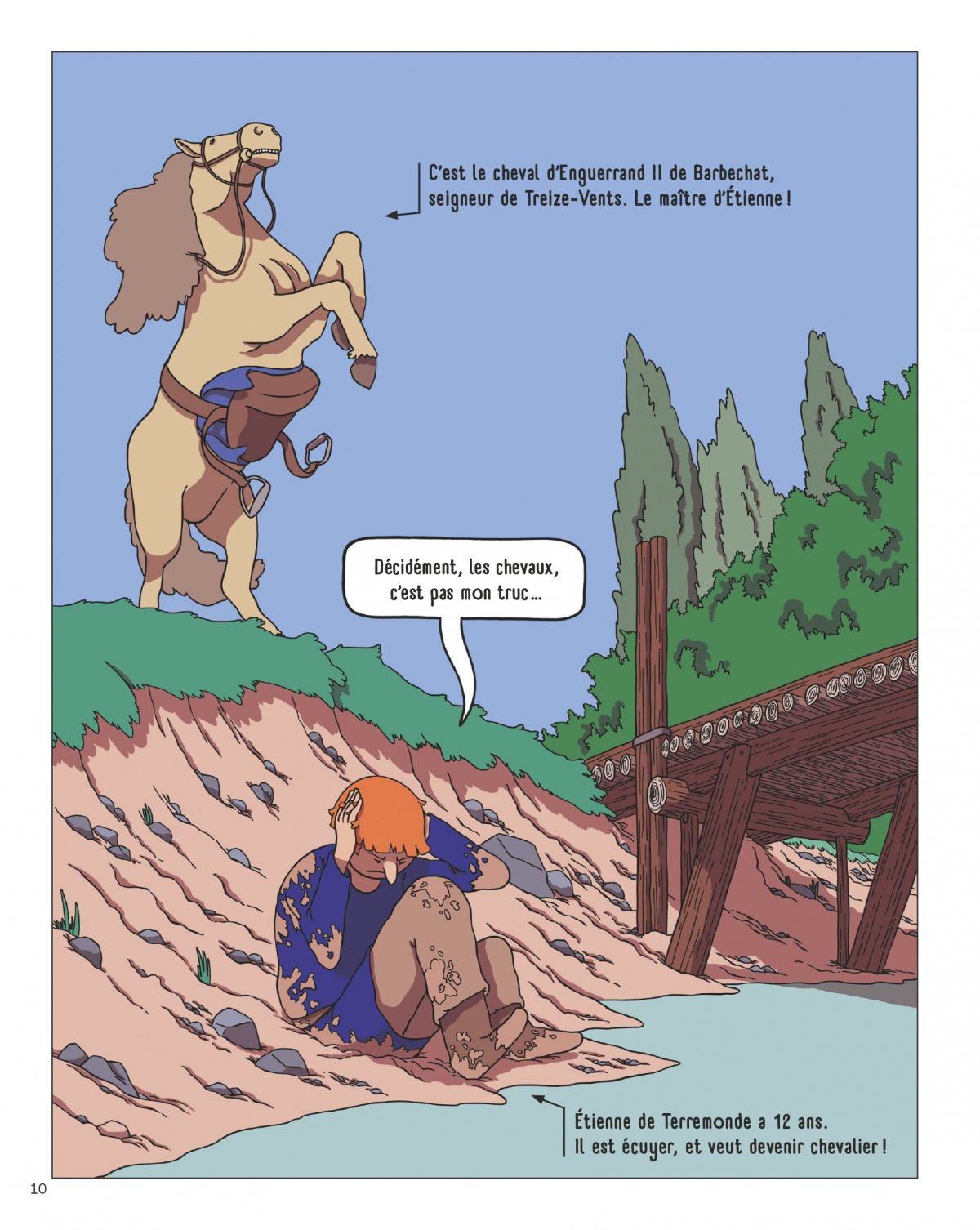 Dans "Chevalier", on suit, durant les vingt premières années de la guerre de Cent Ans, le parcours d’un jeune garçon, Enguerrand, qui grandit et devient chevalier. À côté des étapes clés de la vie d’un chevalier du Moyen Âge, on glane des informations sur la société médiévale, les relations entre les générations, entre les sexes, les enjeux militaires, l’économie de la vie chevaleresque, la réalité des tournois...