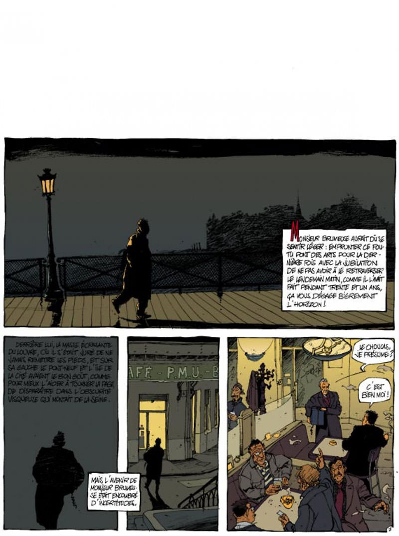 Monsieur Brumeuse, le soir de sa retraite, après trente et un ans passés à l’ombre des grands maîtres (il était gardien de musée), décide de partir sur les traces de son fils décédé d’un accident de la route. Il engage le Choucas afin de retrouver les personnes qui ont connu son fils avant sa mort. Car si l’homme semble être l’archétype du petit fonctionnaire qui ne s’est jamais aventuré au-delà des quatre murs de son musée, son fils vivait, lui, dans une des régions les plus sauvages du Québec. Et le Choucas sait qu’il ne sera pas simple d’obtenir des témoignages dans un coin plus peuplé par les ours que par les hommes. Mais, dans l’avion qui les mène à Montréal, Brumeuse lui avoue le fond de son histoire. Son fils avait choisi de faire don de son corps à la science et l’un de ses reins a sauvé un homme. Il veut savoir qui est cet homme et s’assurer qu’il fait bon usage de ce que lui a légué son fils. Il n’a d’ailleurs pas hésité à voler un tableau pour obtenir ce renseignement ultraconfidentiel. À des milliers de kilomètres de chez lui, le Choucas décide d’aller jusqu’au bout de cette enquête qui lui réservera bien d’autres surprises.</P