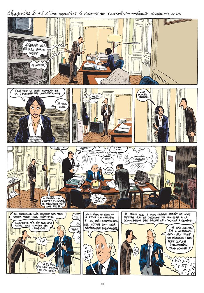 Le jeune Arthur Vlaminck est embauché en tant que chargé du "langage" par le ministre des Affaires étrangères Alexandre Taillard de Worms. En clair, il doit écrire les discours du ministre ! Mais encore faut-il se faire une place entre le directeur du cabinet et les conseillers qui gravitent dans un Quai d’Orsay où le stress, l’ambition et les coups fourrés ne sont pas rares... Inspiré de l’expérience d’Abel Lanzac qui fut conseiller dans un ministère, cet album restitue une vision de la politique à la fois pleine d’acuité et d’humour. Un pur régal !