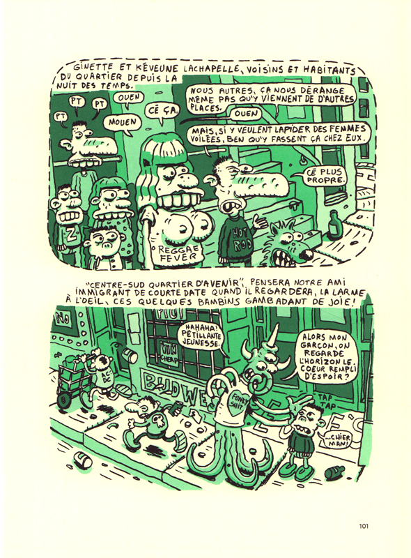 Installé depuis une vingtaine d’années dans le mythique quartier Centre-Sud de Montréal, Richard Suicide signe enfin la toute première étude anthropologique sérieuse - sous forme de bande dessinée - sur la faune (houblonnée) et la flore (gastrique) du vénérable quartier. Fiches pratiques et graphiques explicatifs à l’appui, l’auteur livre entre deux brosses un portrait touchant de ces éclopés qui se sont enfargés dans la rue Sherbrooke pour ensuite débouler la côte jusqu’à la rue Ontario