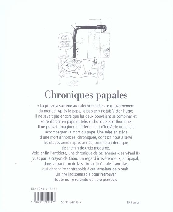 " La presse a succédé au catéchisme dans le gouvernement du monde. Après le pape, le papier " notait Victor Hugo ; il ne savait pas encore que les deux pouvaient se combiner et se renforcer en pape et télé, catholique et cathodique. Il ne pouvait imaginer le déferlement d’idolâtrie qui allait accompagner la mort du pape. Une mise en scène d’une mort annoncée, chroniquée, dont on nous a servi les étapes année après année, comme un décalque de chemin de croix moderne. Voici enfin l’antidote, une chronique de ces années "Jean-Paul II" vues par le crayon de Cabu. Un regard irrévérencieux, antipapal, dans la tradition de la satire anticléricale française, qui vient faire contrepoids à ces semaines de plomb. Un rire indispensable pour retrouver toute notre sérénité de libre penseur.