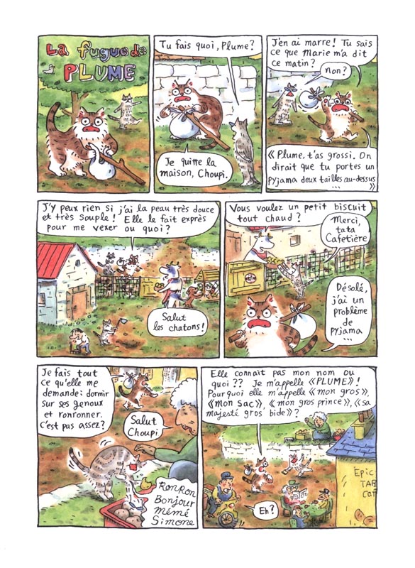 Au Club des chats, on a le droit de se poursuivre dans toute la maison, de faire ses griffes sur le canapé, de renverser le sac de croquettes, de gratter la terre des pots de fleurs, et même de dormir toute la journée... Tout ce qui rend un chat vraiment heureux, quoi ! Dans le club, il y a Marie, une jeune artiste peintre, et ses trois chats : Choupi, Plume et Nounours. Ces trois-là sont champions pour les bêtises et pour troubler le calme et la concentration de leur maîtresse. Mais il y a aussi les voisins : Tanguy le facteur amoureux, Cafetière la vache laitière, Mr Kim l’homme-chien, Charlotte la copine envahissante et toute la bande des mémères à chats qui font de ce petit village à la campagne un grand n’importe quoi