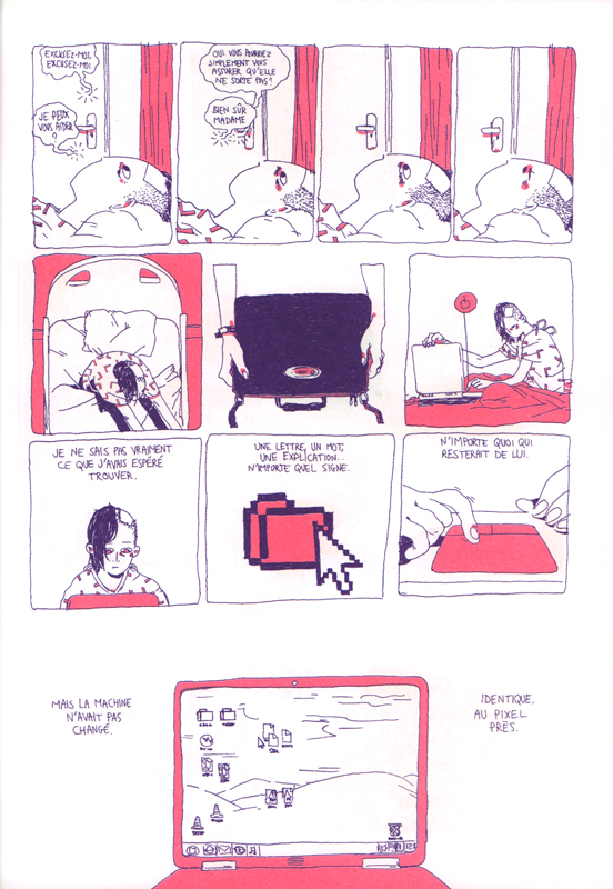 Malgré ce don, elle n’a pas pu prévenir le vol de son ordinateur. Au hasard d’une soirée, elle retrouve les voleurs mais les deux compères ne lui rendent pas de suite son précieux bien : commence alors un jeu vicieux de chantage et de mise en confiance, une aventure entre marginaux qui, chacun à leur manière, cherchent leur place. Le livre d’Aniss El Hamouri est un long périple violent à travers la vie d’une jeune fille en souffrance : un récit âpre et poétique au service d’un trait nerveux et contemporain, qui ne cherche pas à séduire, mais à raconter la folle épopée glauque de Renata, triste et fragile chenille en transformation vers sa forme ultime de papillon de nuit. Le travail de l’auteur tourne autour de la métamorphose : comment réussir à changer malgré la violence du monde, de la maladie, comment éclore dans un milieu hostile et enfin se trouver ?