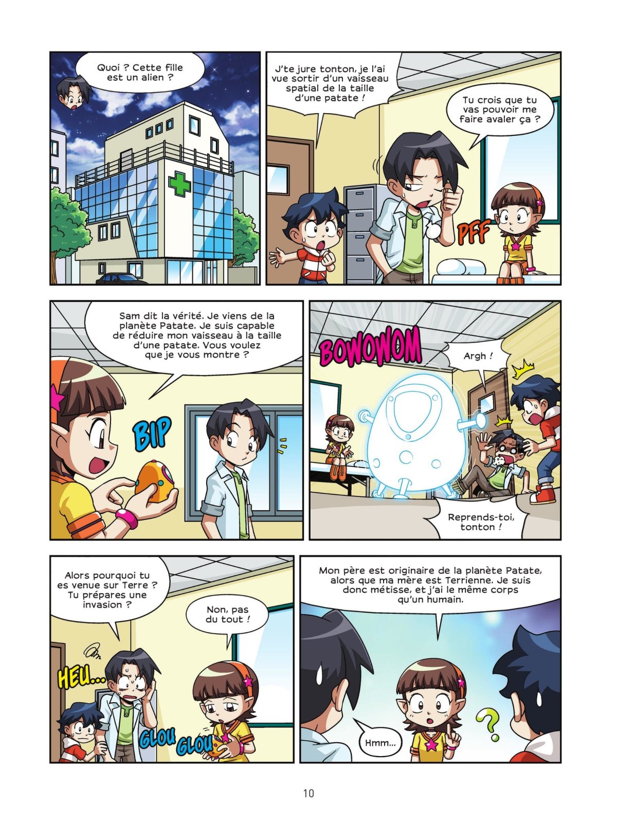 Sam rentre tranquillement des courses lorsqu’il tombe nez à nez avec un vaisseau spatial. Piloté par la jeune extraterrestre Alya, celui-ci vient de la planète Patate. La voyant blessée, Sam l’emmène au cabinet de son oncle médecin, ce qui arrange bien la jeune fille. Elle est venue sur Terre pour apprendre comment fonctionne le corps humain car sa mère, une humaine, est tombée malade. Le docteur va donc embarquer Sam et Alya dans une aventure pédagogique qui les amènera à découvrir le fonctionnement des os, des muscles de la peau, mais aussi des systèmes digestifs, respiratoires et nerveux !